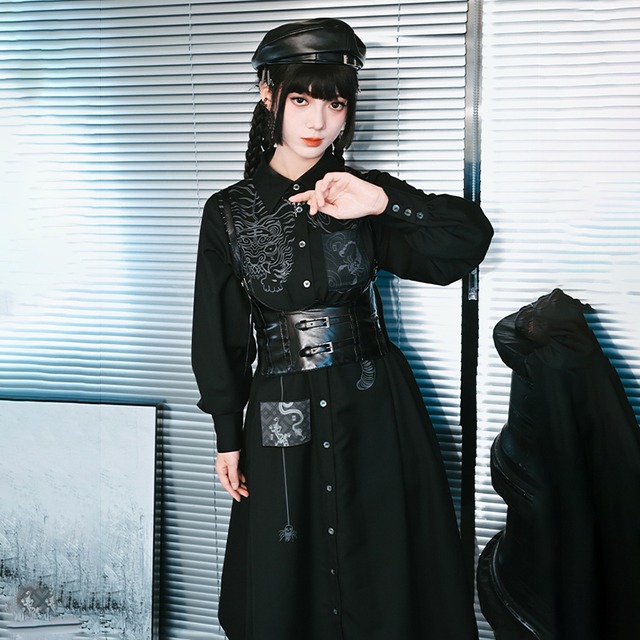 【古怪舍---五毒シリーズ】★チャイナ風ワンピース★ シャツワンピース プリント 個性的 ブラック 黒い