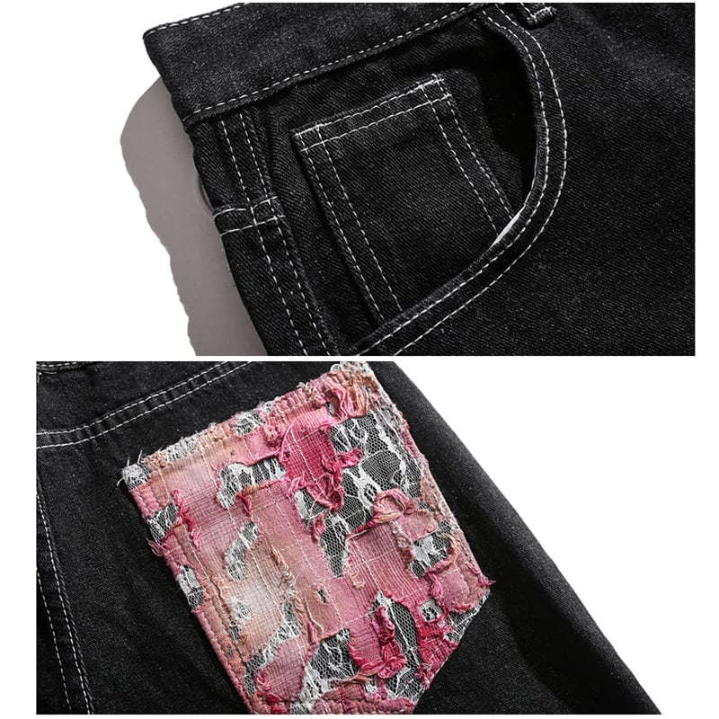 【BMOBシリーズ】★デニムパンツ★ ボトムス ズボン 男女兼用 メンズ 切り替え レトロ ブラック 黒い