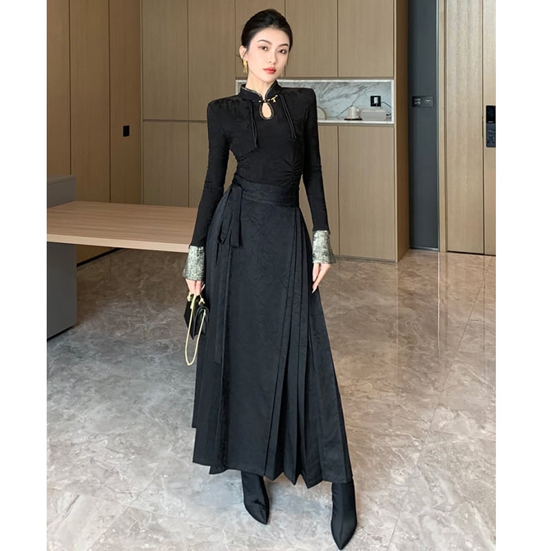 【XINGYOUシリーズ】★チャイナ風トップス★ Tシャツ 長袖 男女兼用 メンズ ブラック 黒い 着痩せ