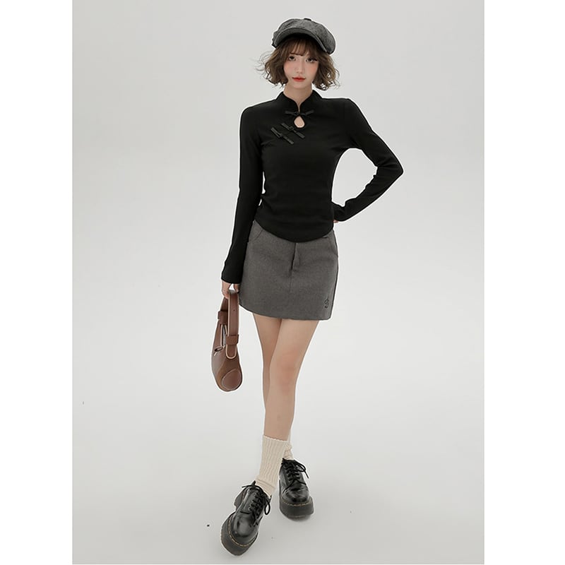 【Girlyhaloシリーズ】★チャイナ風トップス★ Tシャツ 長袖 レディース 着痩せ ブラック 黒い 合わせやすい
