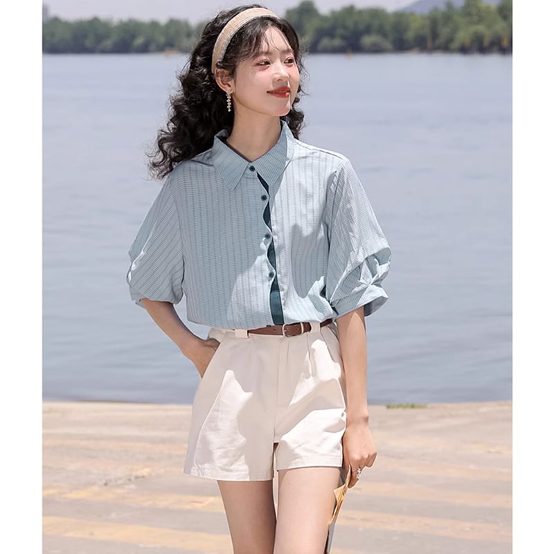 【MUTUシリーズ】★トップス★ 3color シャツ レディース 配色 縦縞 縞模様 夏服 ブルー ピンク グリーン 青 緑