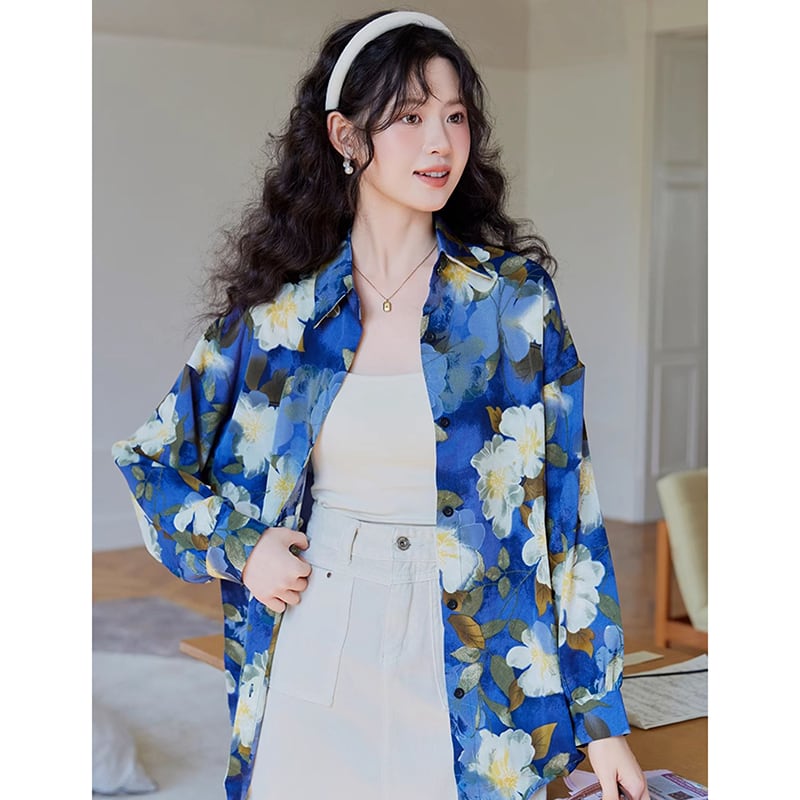 【MUTUシリーズ】★シャツ★ トップス 長袖シャツ 花柄シャツ レディース 気質アップ ブルー 青い