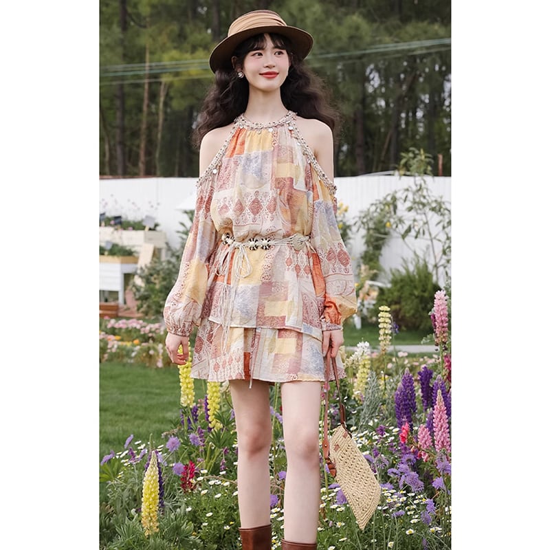 【MUTUシリーズ】★セットアップ★ トップス+短パン 花柄 レディース 気質アップ デート 肩出し 夏服 可愛い