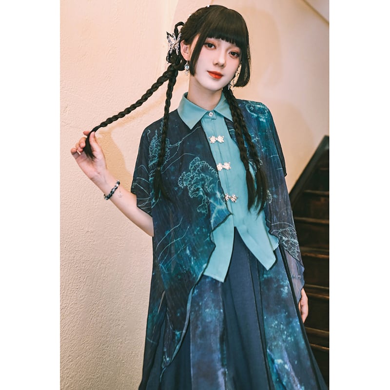 【古怪舍---藍界浮熒シリーズ】★チャイナ風トップス★ シャツ 半袖シャツ オリジナル 不規則 ブルー 青い フェイクレイヤード シフォン