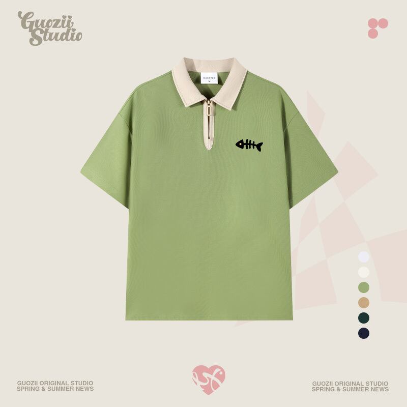 【Guoziiシリーズ】★POLOシャツ★ 7color トップス メンズ 男女兼用 レディース メンズ 魚骨 可愛い