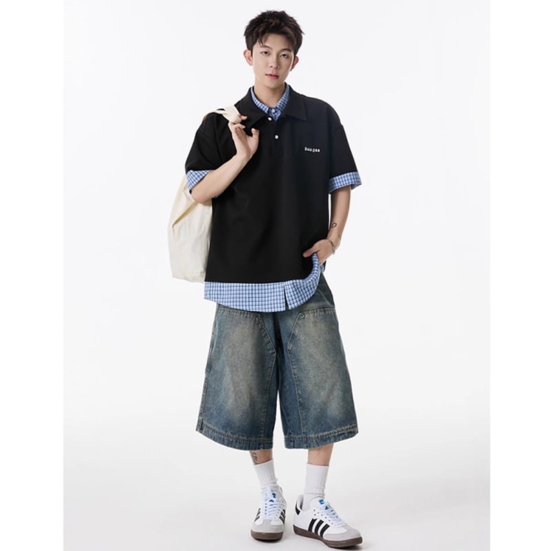 【Qotriockシリーズ】★POLOシャツ★ 3color トップス 男女兼用 メンズ フェイクレイヤード 黒 白 灰 チェック柄