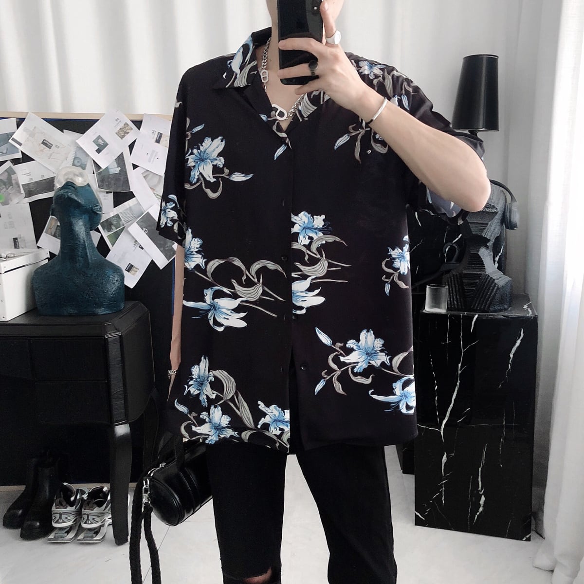 【FUDEリーズ】★シャツ★ 花柄シャツ トップス 半袖 男女兼用 メンズ プリント アロハシャツ ブラック 黒い