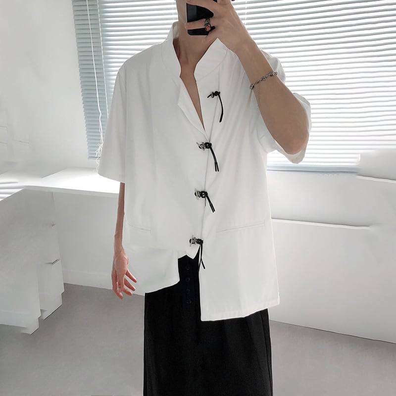 【FUDEリーズ】★チャイナ風トップス★ 2color シャツ 半袖 男女兼用 メンズ 合わせやすい ブラック ホワイト 黒 白