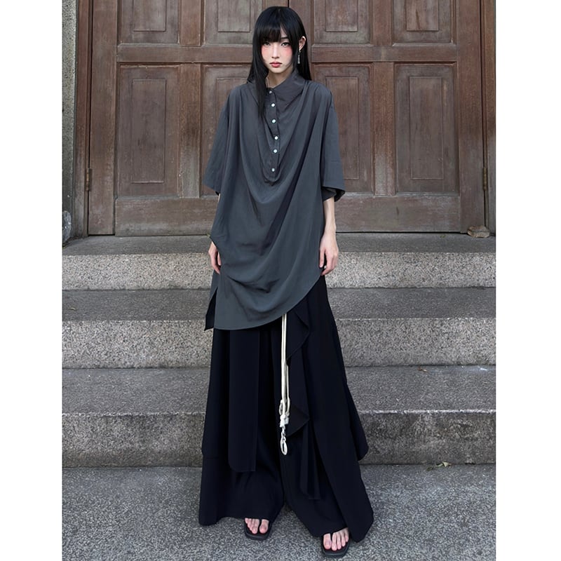 【FG721シリーズ】★チャイナ風トップス★ 3color シャツ 半袖シャツ 男女兼用 メンズ 不規則 黒 灰 ブラック グレー アプリコット