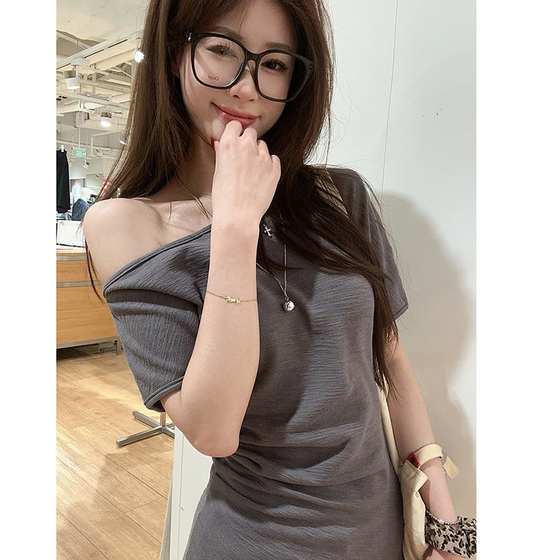 【KEKELIシリーズ】★Tシャツ★ 3color レディース 夏服 斜め襟 半袖Tシャツ 肌見せ セクシー 可愛い