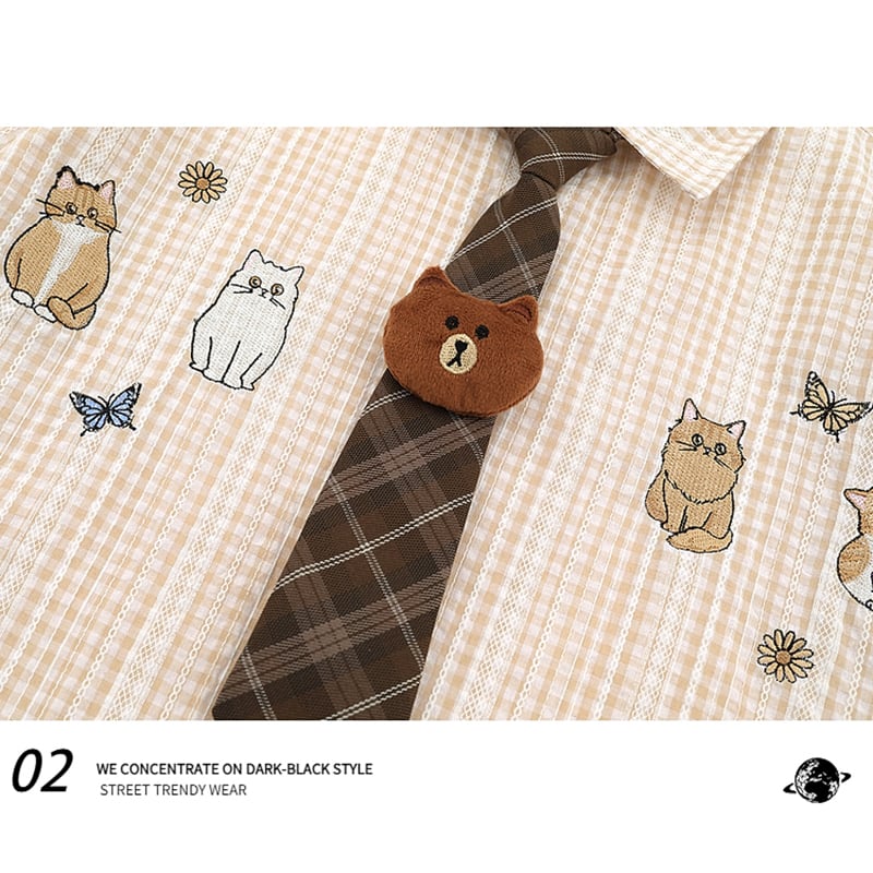 【逃離地球シリーズ】★シャツ★ 2color ネクタイ付きシャツ トップス 刺繍入り 猫 ねこ ネコ 半袖 男女兼用 メンズ レディース チェック柄