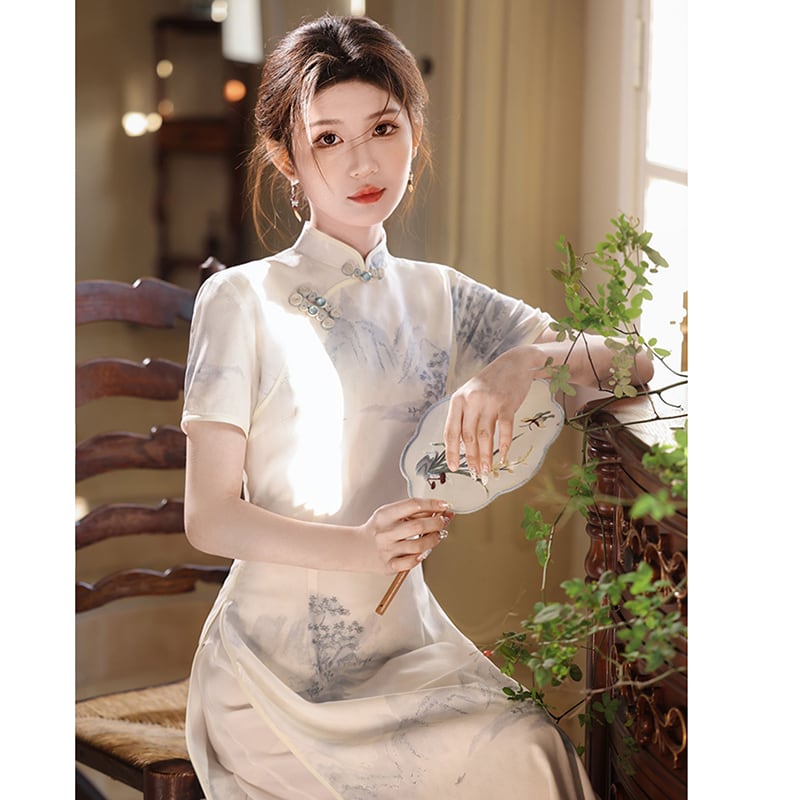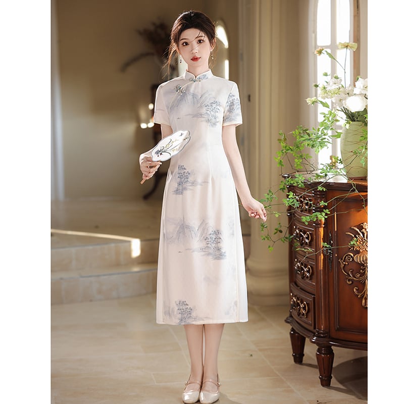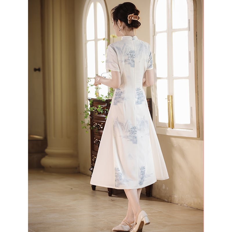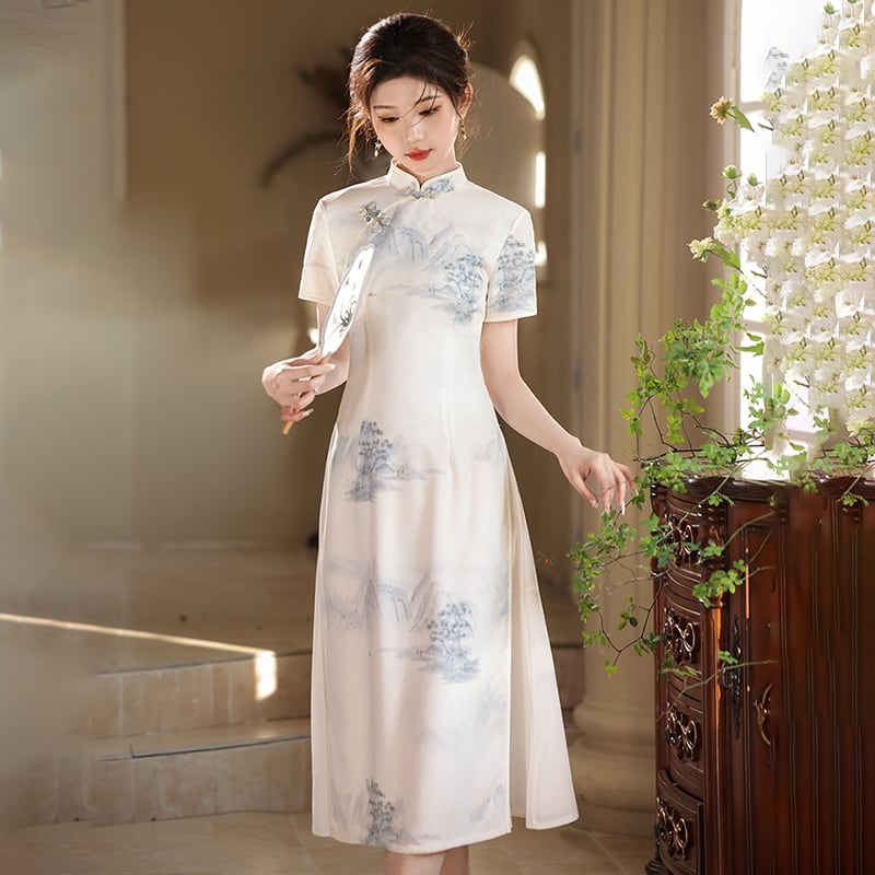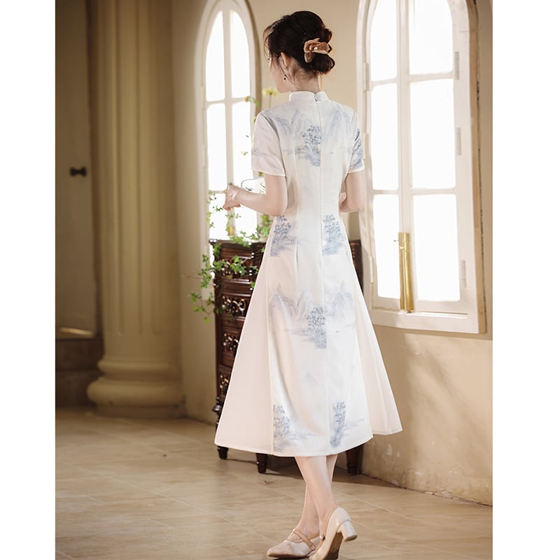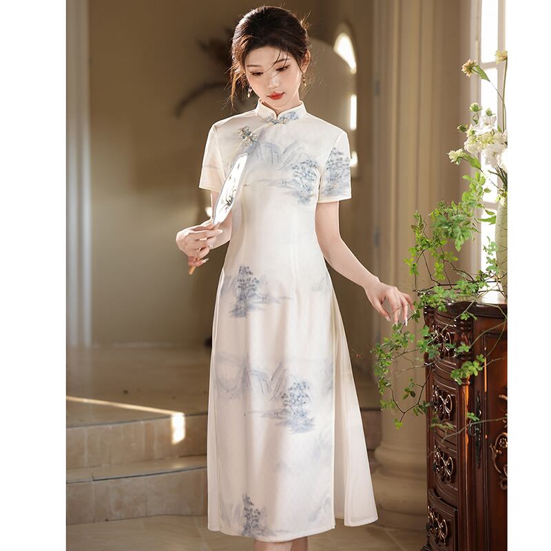 【HONGSHEシリーズ】★チャイナ風ワンピース★ チャイナドレス 半袖 大きいサイズ 気質アップ 水墨柄