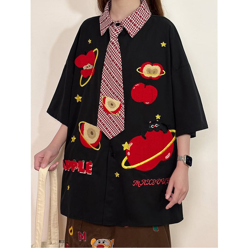 【UATONLINEシリーズ】★シャツ★ 2color トップス ネクタイ付き 半袖 男女兼用 メンズ りんご 可愛い 黒 黄