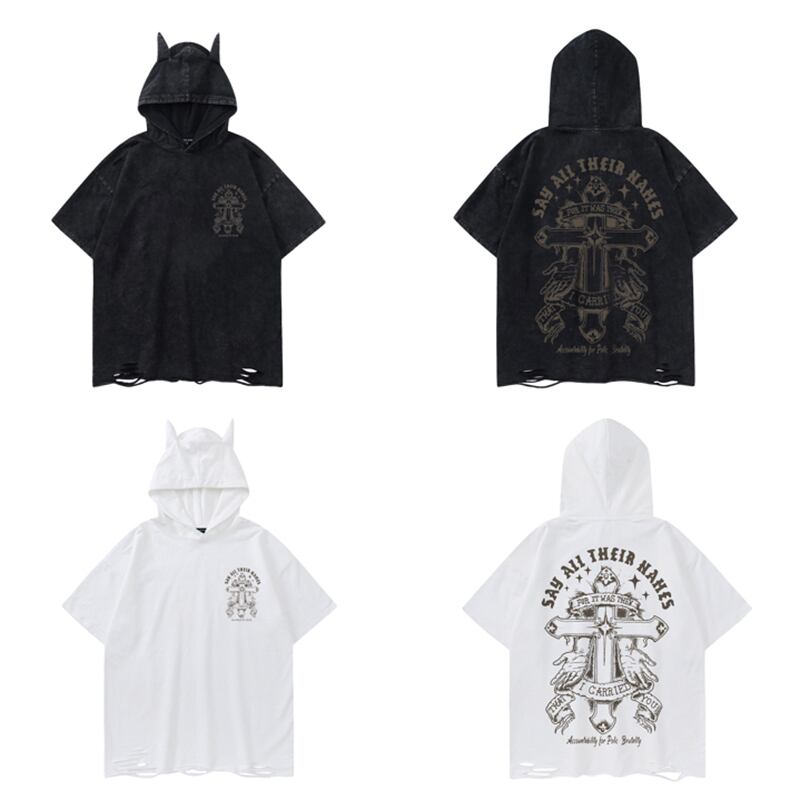 【悟シリーズ】★トップス★ 2color フード付き パーカー Tシャツ 半袖 男女兼用 メンズ レトロ 十字架