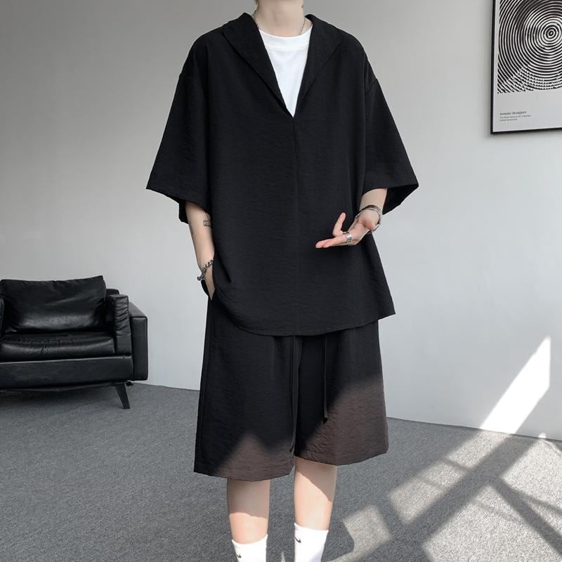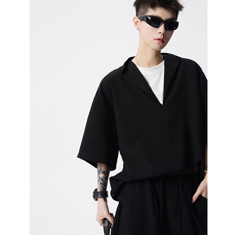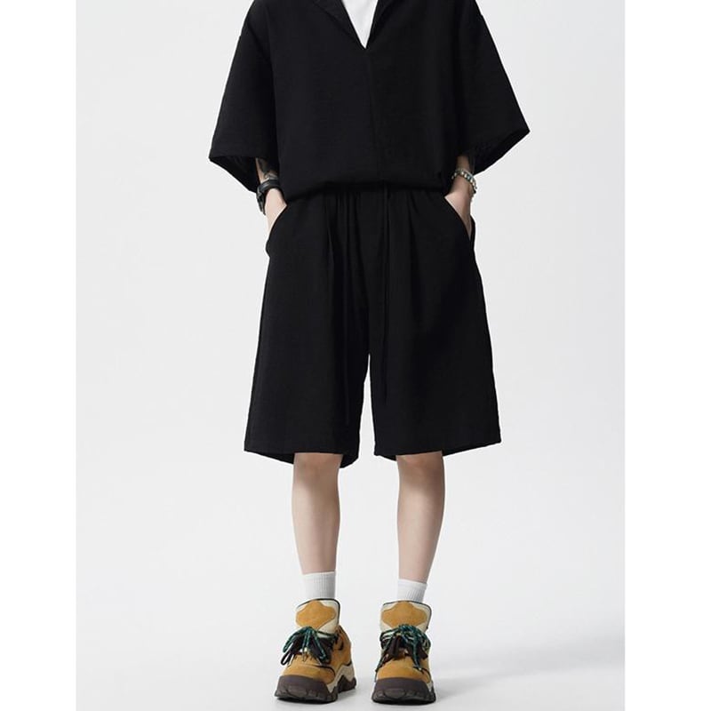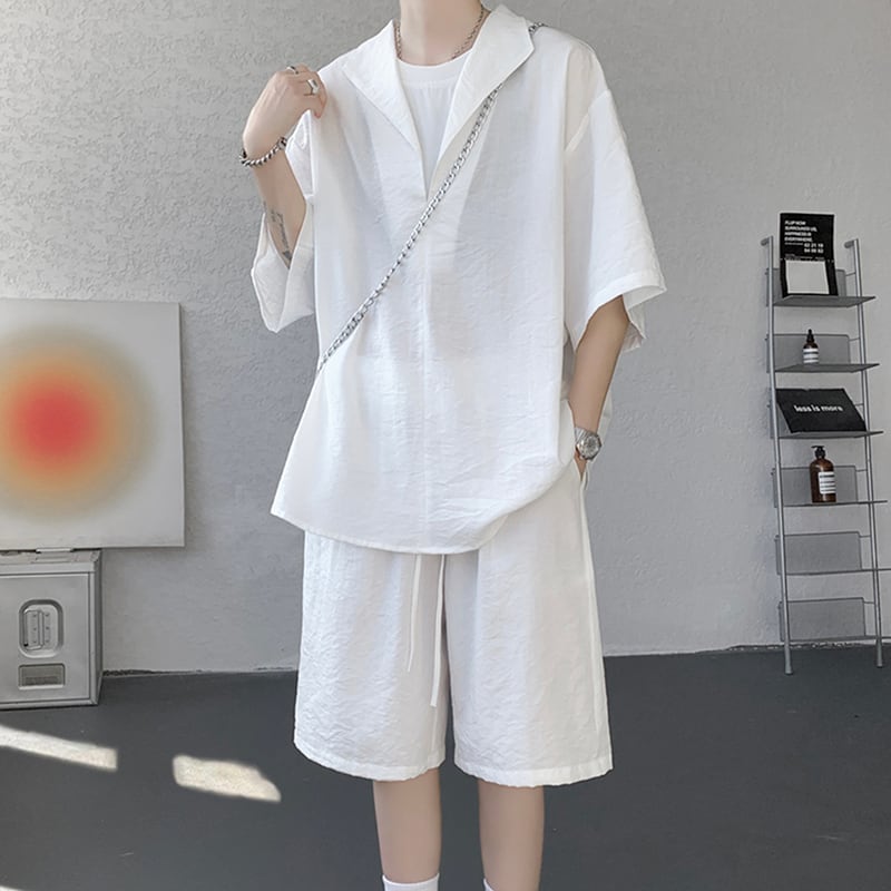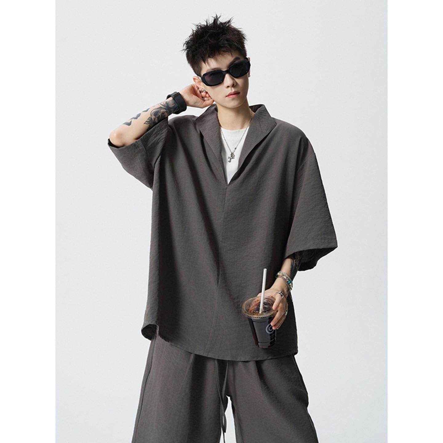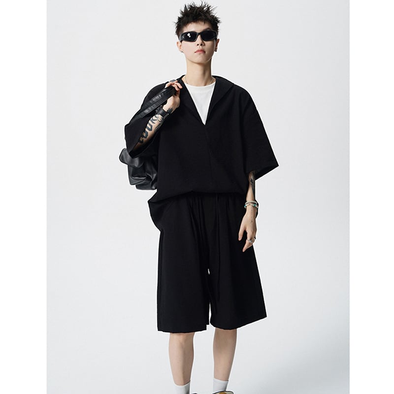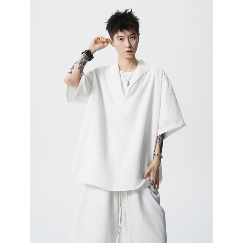 【CEXUシリーズ】★チャイナ風セットアップ 単品注文★ 3color トップスor短パン 男女兼用 メンズ 大きいサイズ 黒 白 灰 フェイクレイヤード