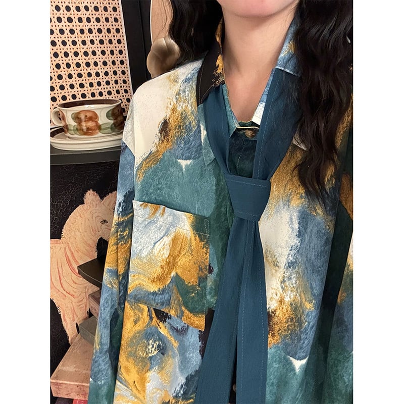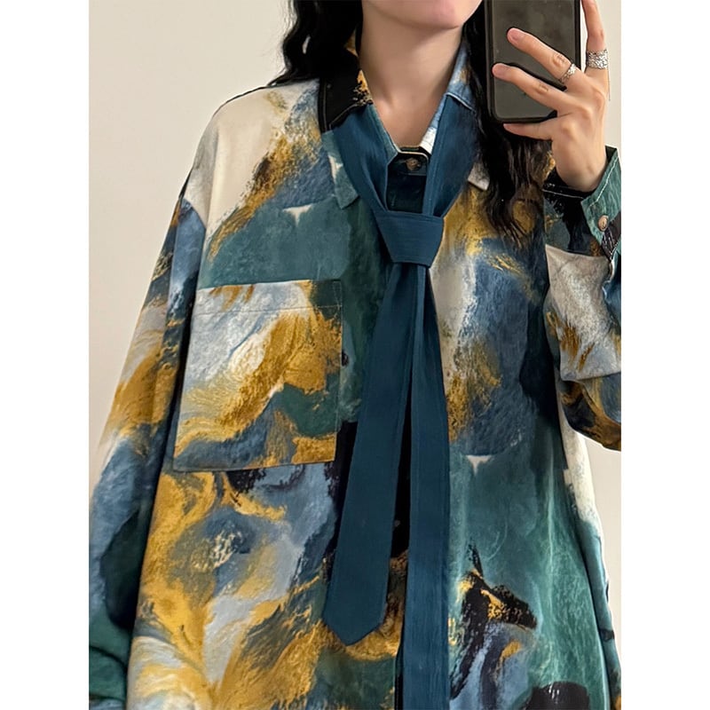 ✿秋新作!【UATONLINEシリーズ】★ネクタイ付きシャツ★ 油絵風 トップス 長袖シャツ 男女兼用 メンズ プリント レトロ