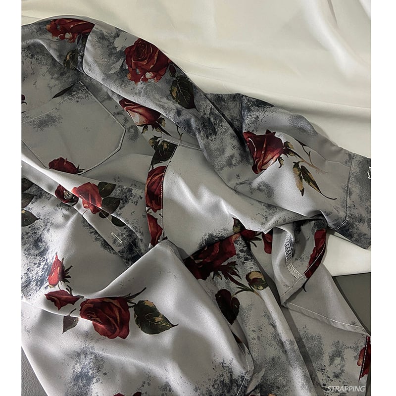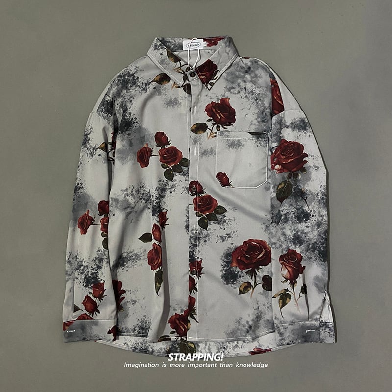 【STRAPPINGシリーズ】★シャツ★ 油絵風 トップス 長袖シャツ 男女兼用 メンズ グレー 薔薇 グレー 灰色