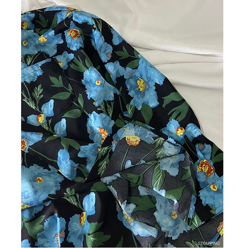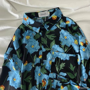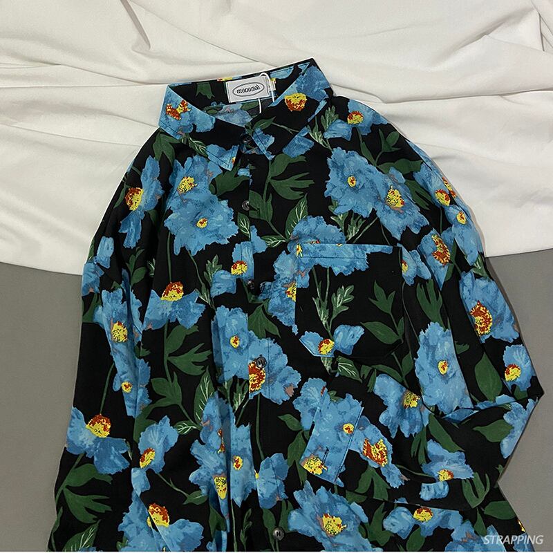 【STRAPPINGシリーズ】★シャツ★ トップス 長袖シャツ 男女兼用 メンズ 花柄 合わせやすい ブラック 黒い 青
