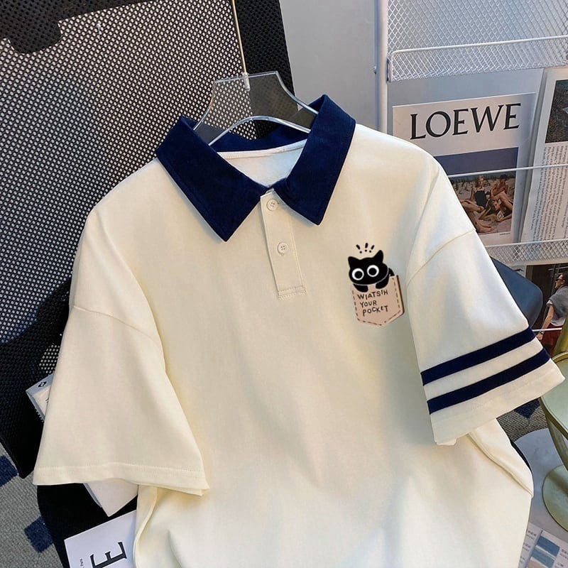 【YPXZシリーズ】★POLOシャツ★ 2color 猫 ねこ ネコ 半袖 トップス レディース 配色 夏服 ネイビー ベージュ