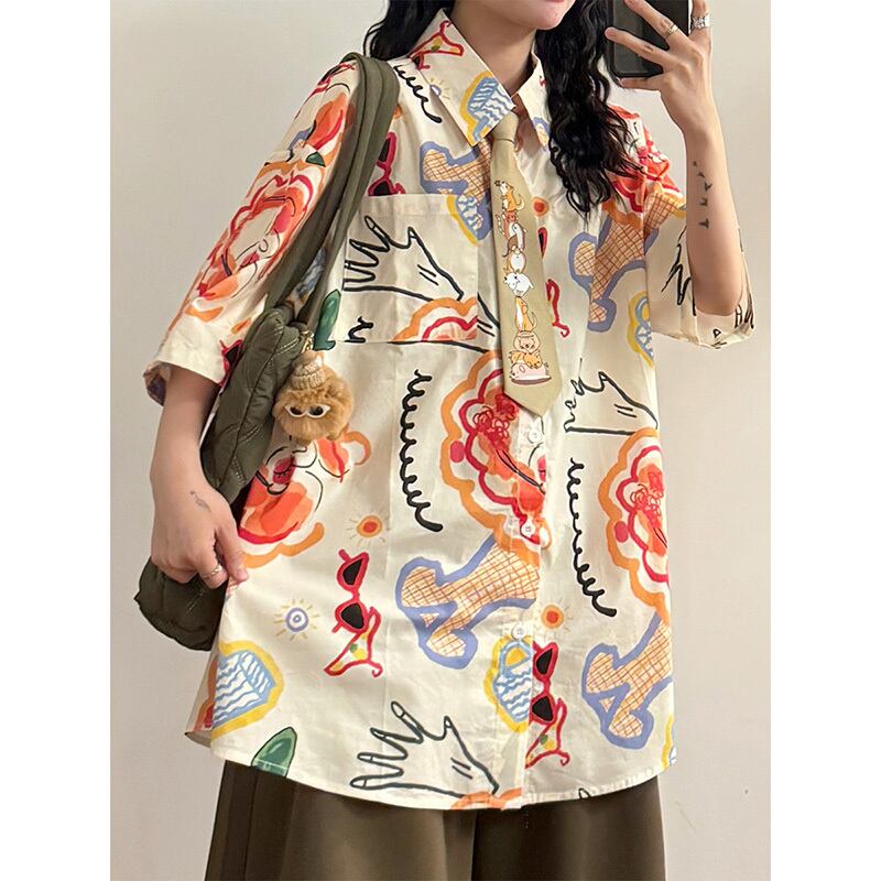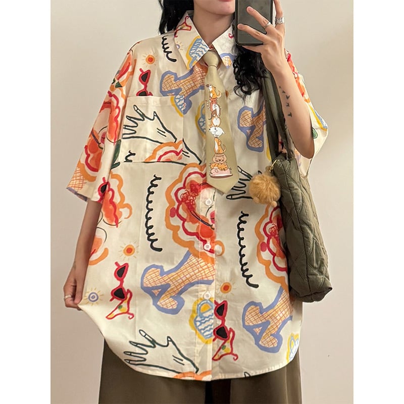 【UATONLINEシリーズ】★ネクタイ付きシャツ★ 猫 犬 落書き トップス 男女兼用 メンズ 夏服 可愛い