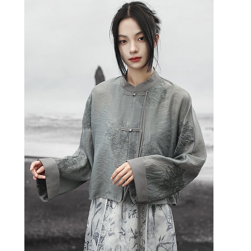 【大青龍肆シリーズ】★チャイナ風アウター★ 刺繍 花柄 長袖 デザイン性有り 中華服 気質アップ 灰色 グレー