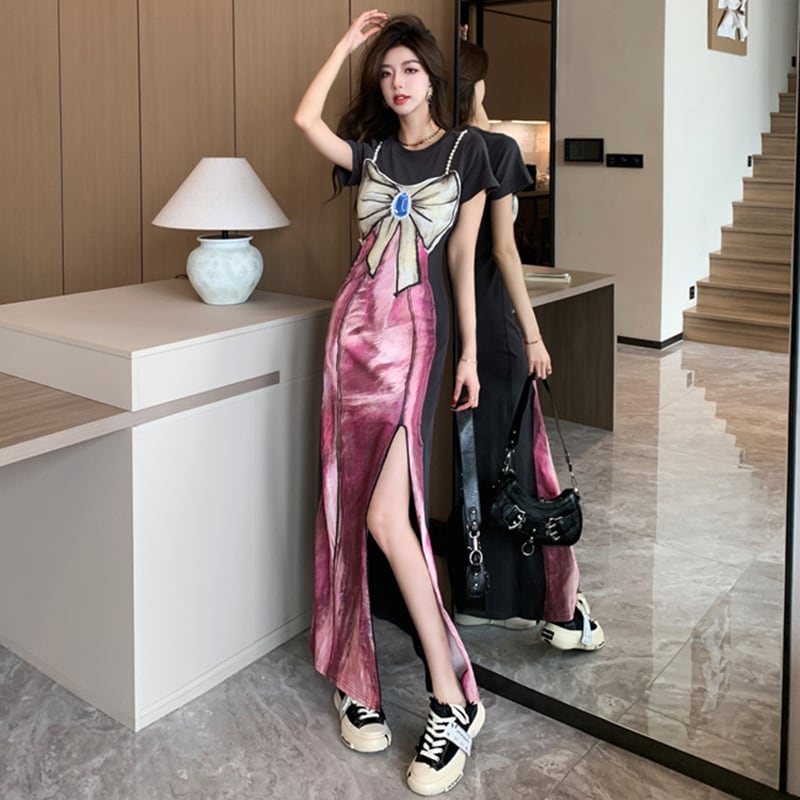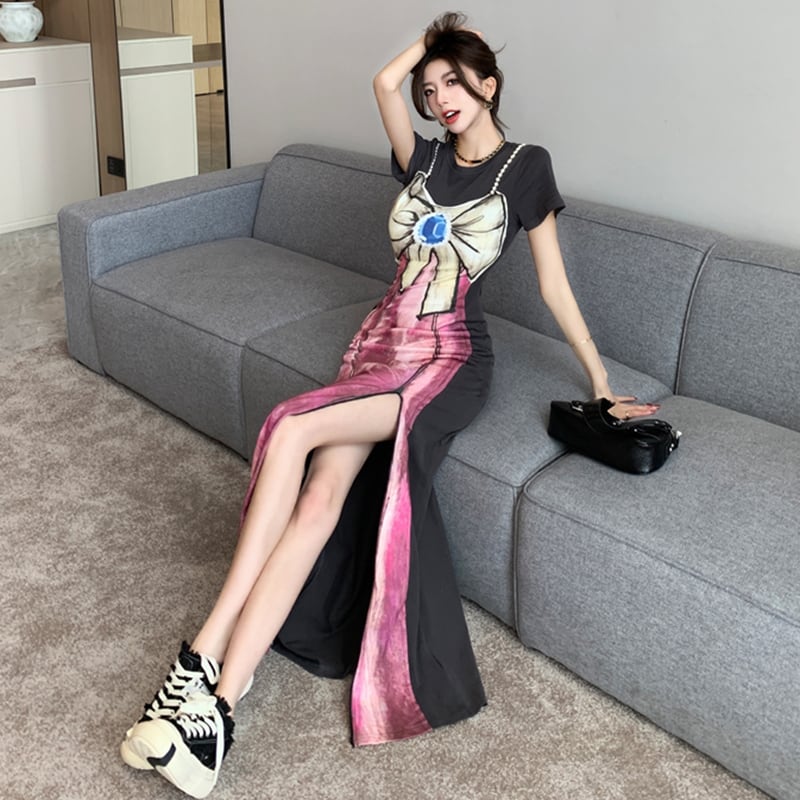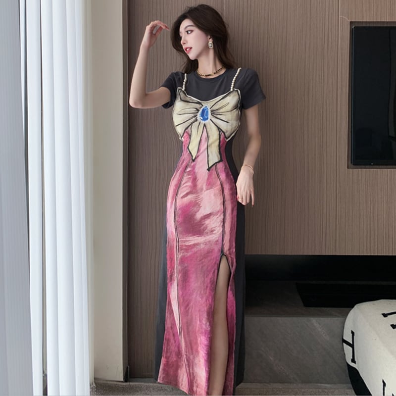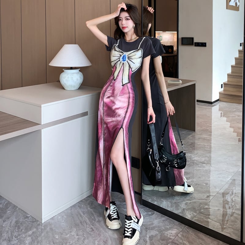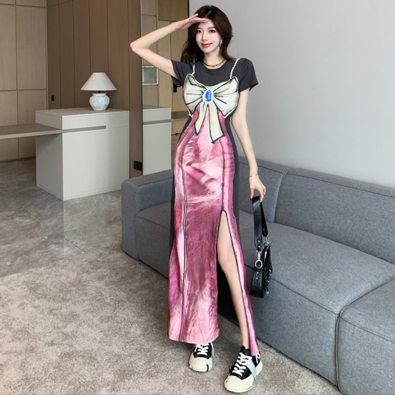 【Sundayシリーズ】★ワンピース★ フェイクレイヤード 切り替え 気質アップ リボン プリント スリット 着痩せ