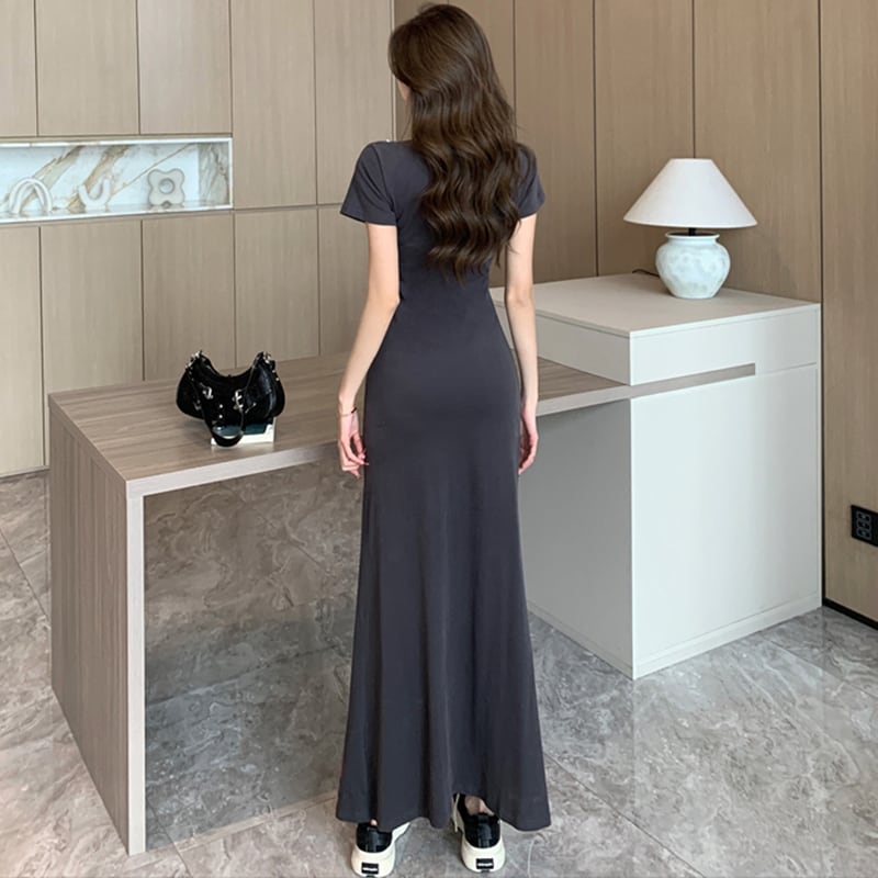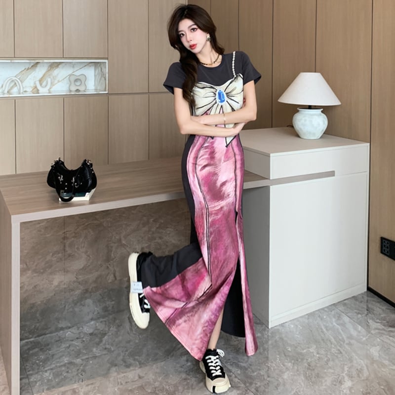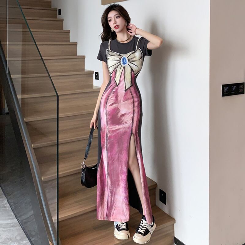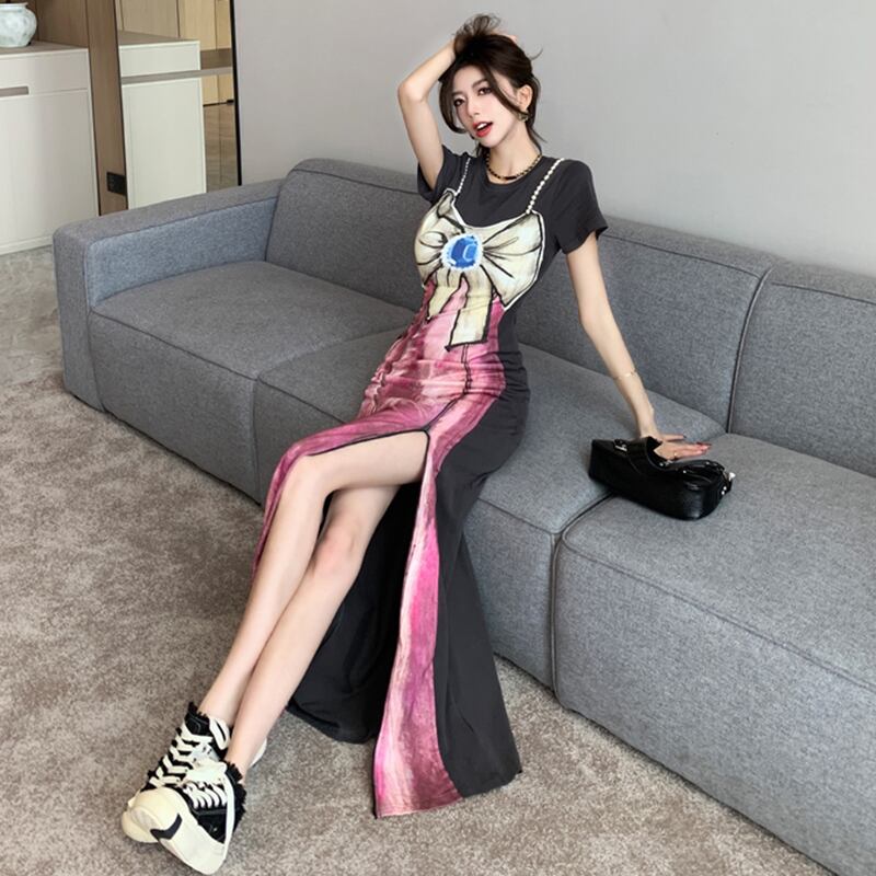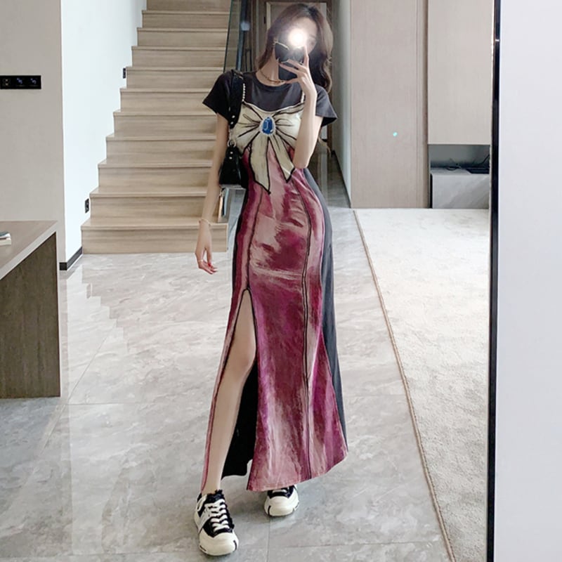 【Sundayシリーズ】★ワンピース★ フェイクレイヤード 切り替え 気質アップ リボン プリント スリット 着痩せ