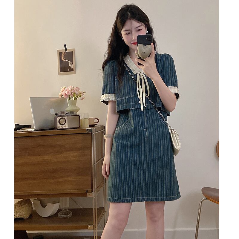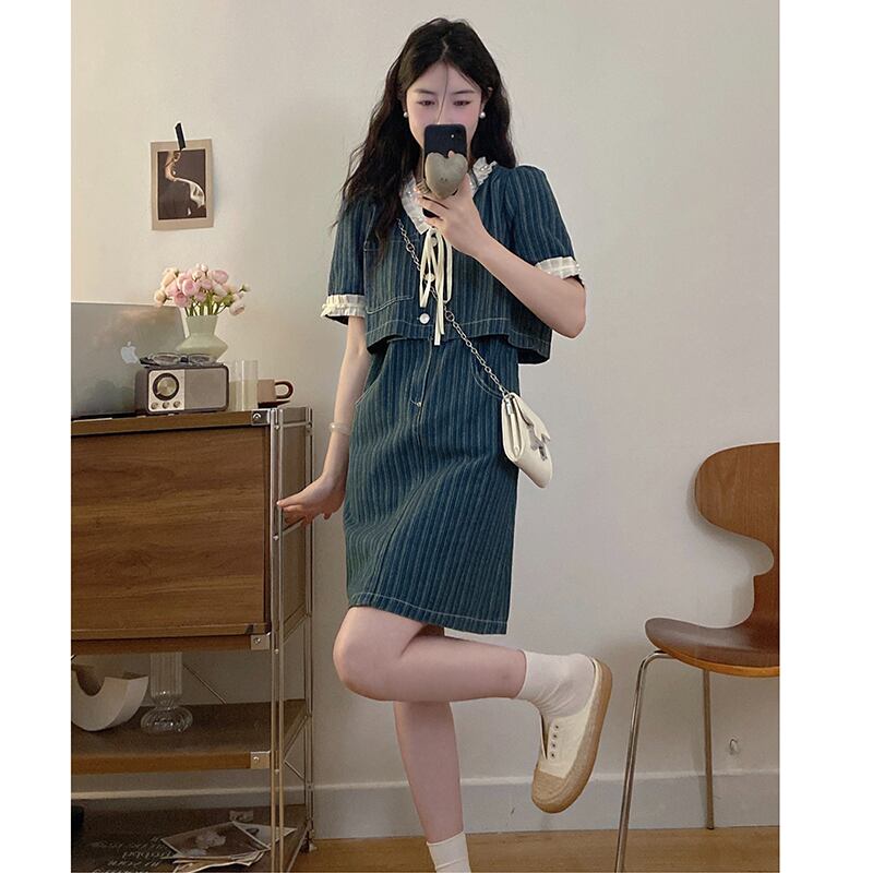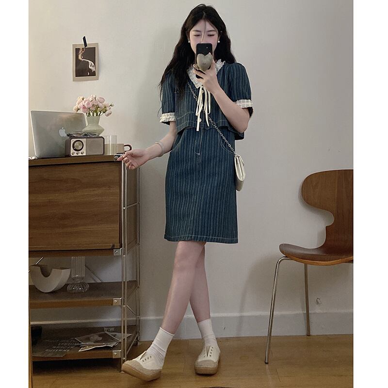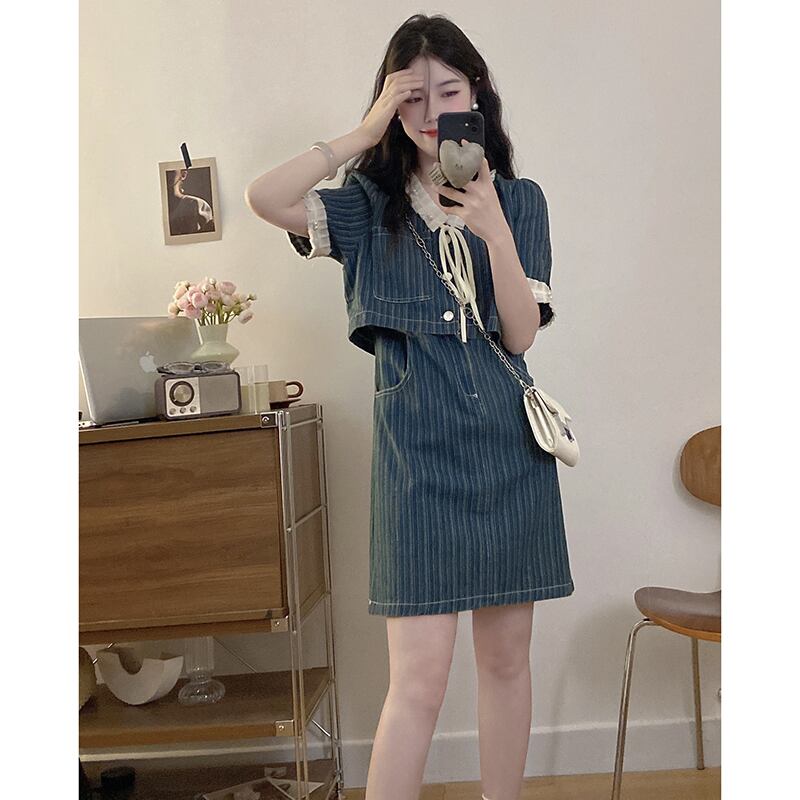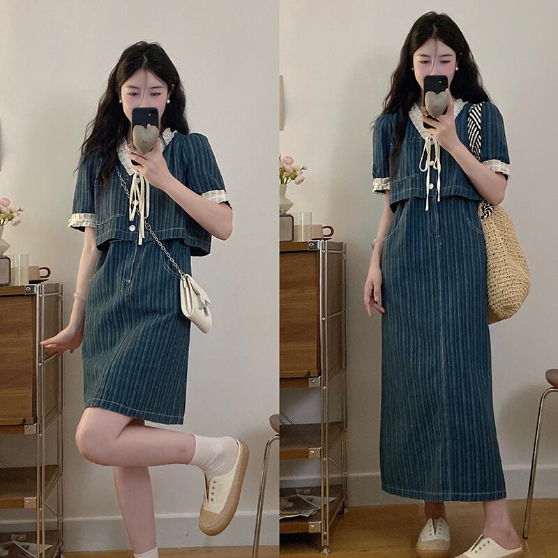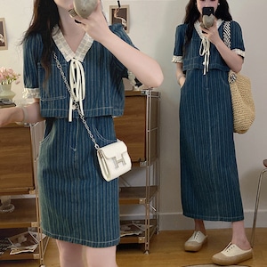 【JIGUJIGUシリーズ】★ワンピース★ ショート丈orロング丈 レディース 半袖 フェイクレイヤード 切り替え ブルー 青い デニム