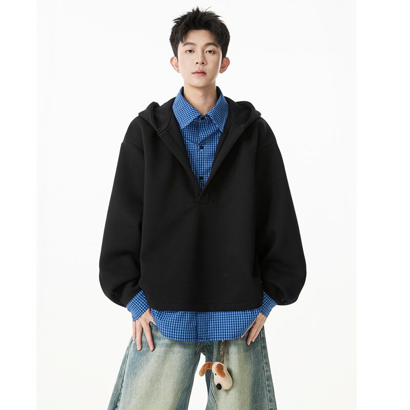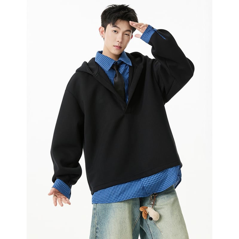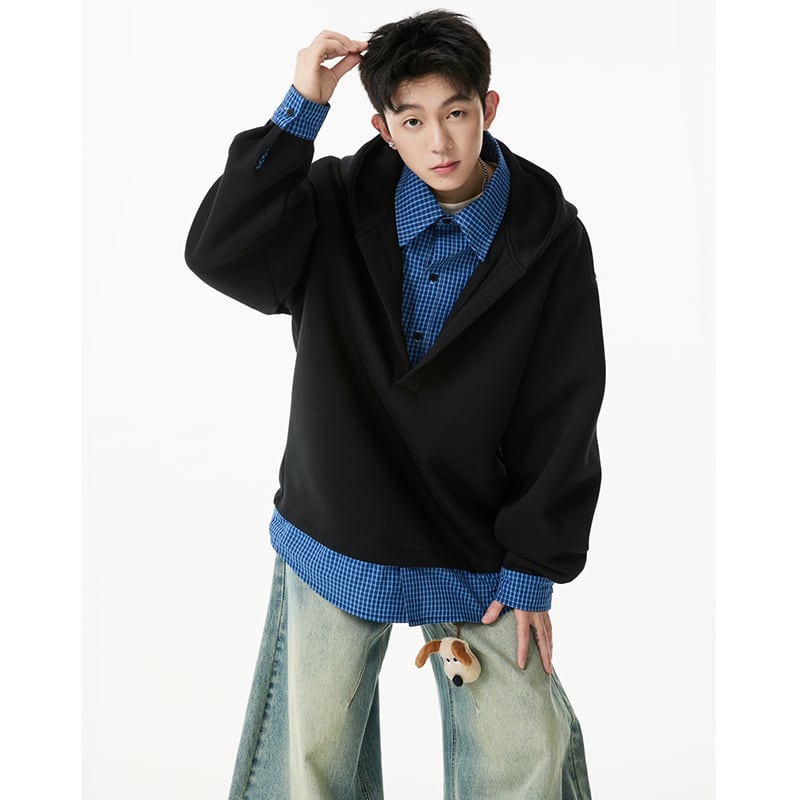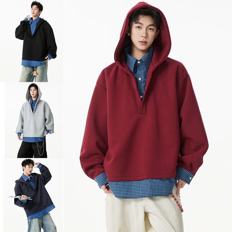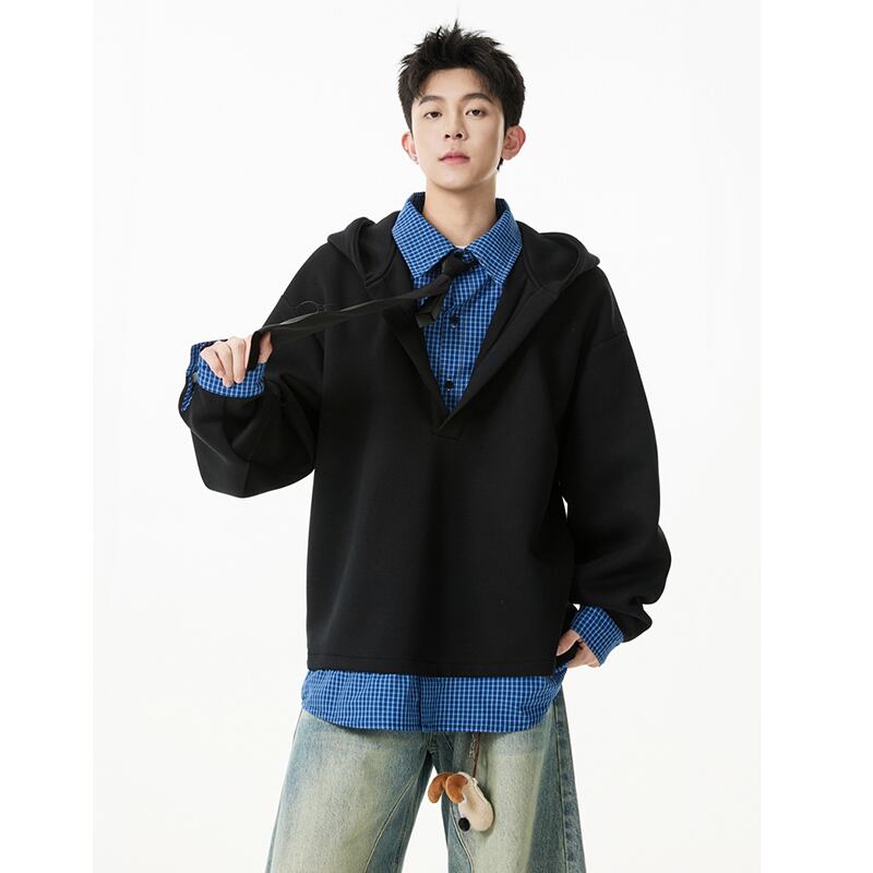 【Vesiboシリーズ】★パーカー★ 4color トップス 男女兼用 メンズ フェイクレイヤード チェック柄 赤 灰 黒 青