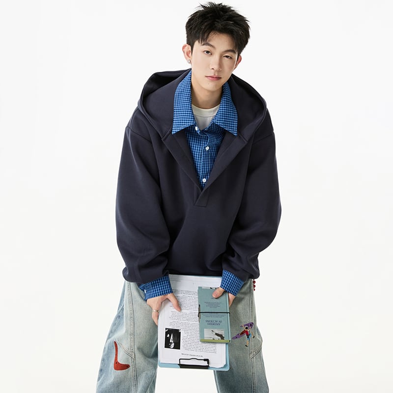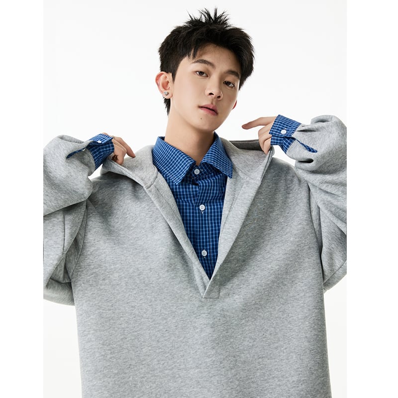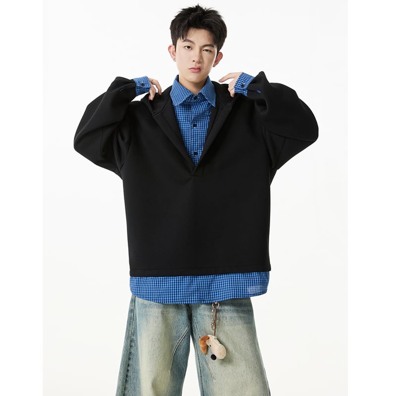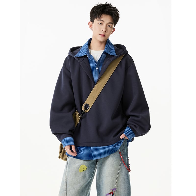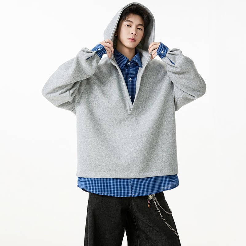 【Vesiboシリーズ】★パーカー★ 4color トップス 男女兼用 メンズ フェイクレイヤード チェック柄 赤 灰 黒 青