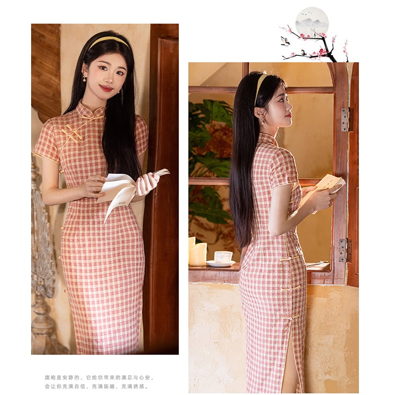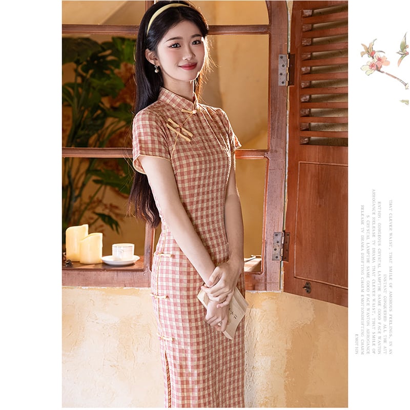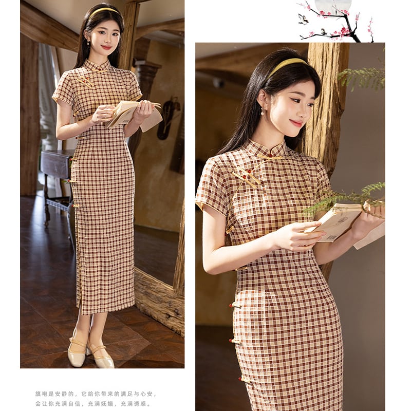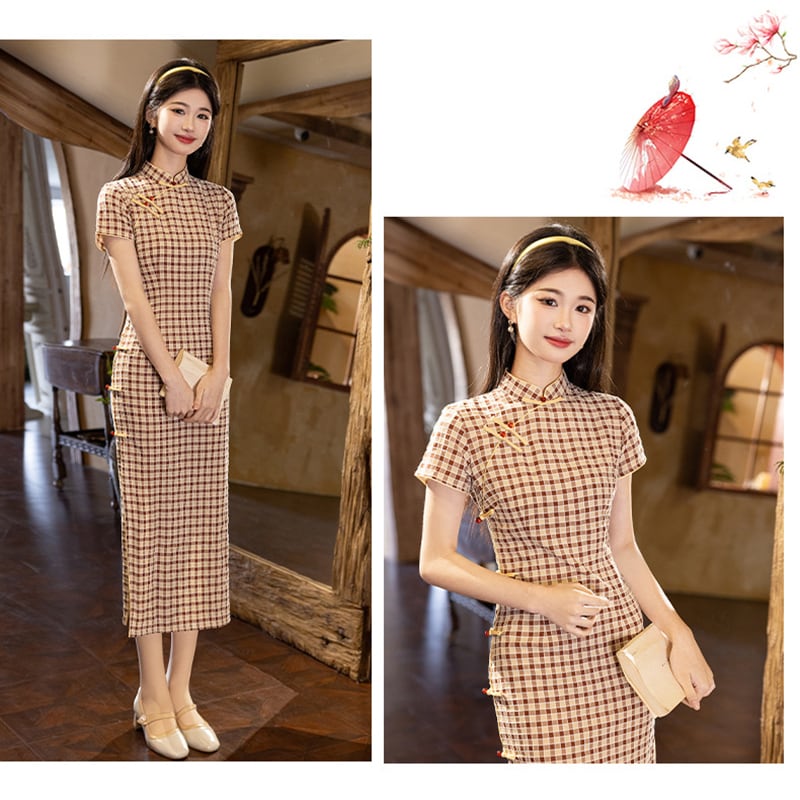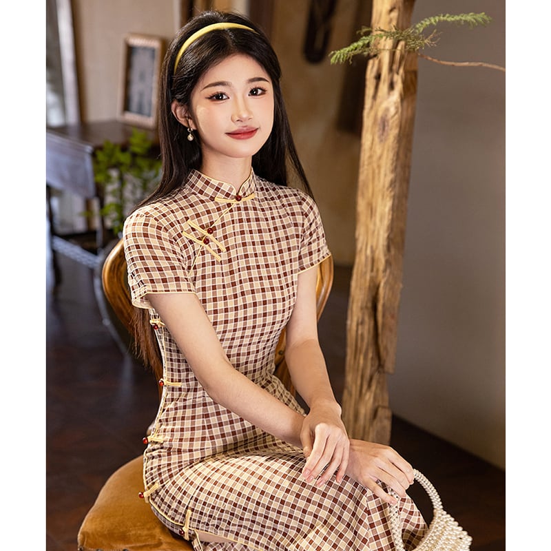 【YONGSHENGシリーズ】★チャイナドレス★ 2color チャイナ風ワンピース チェック柄 着痩せ デート パーティー 結婚式