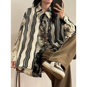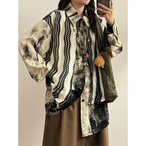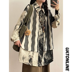【UATONLINEシリーズ】★チャイナ風トップス★ 長袖シャツ トップス 男女兼用 メンズ フェイクレイヤード 絞り染め