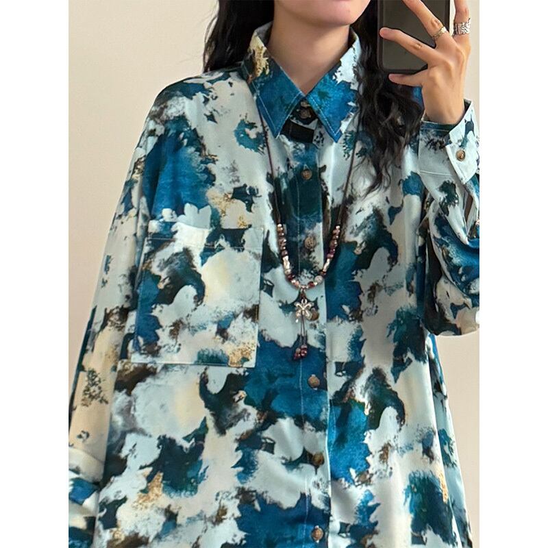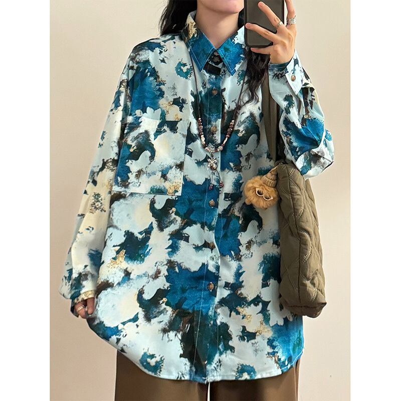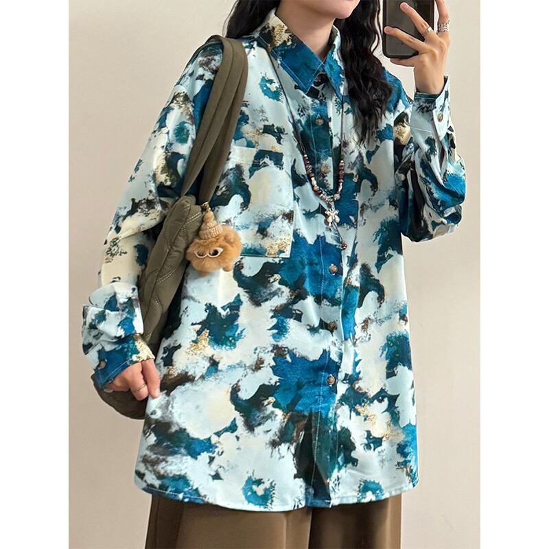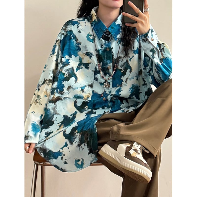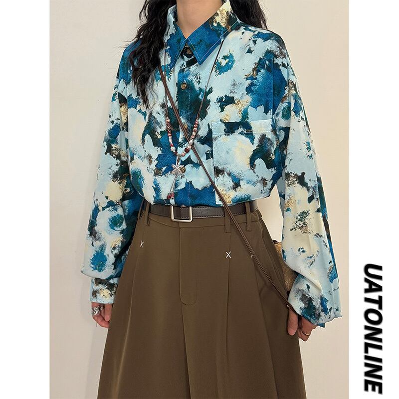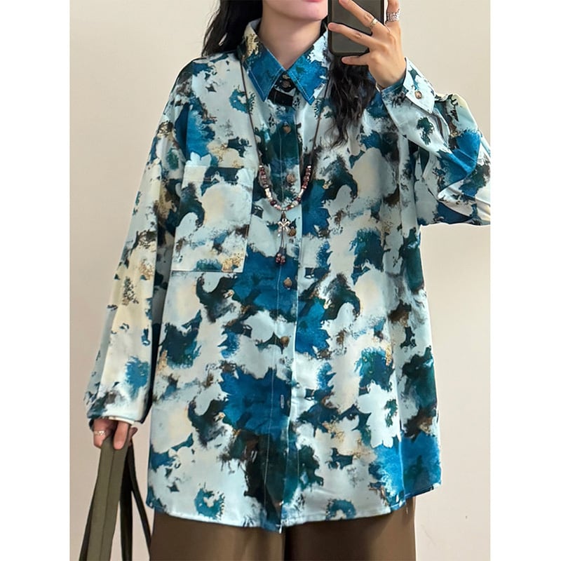 ✿秋新作!【UATONLINEシリーズ】★チャイナ風トップス★ ネックレスを含む 長袖シャツ シャツ 油絵風 男女兼用 メンズ ブルー 青い
