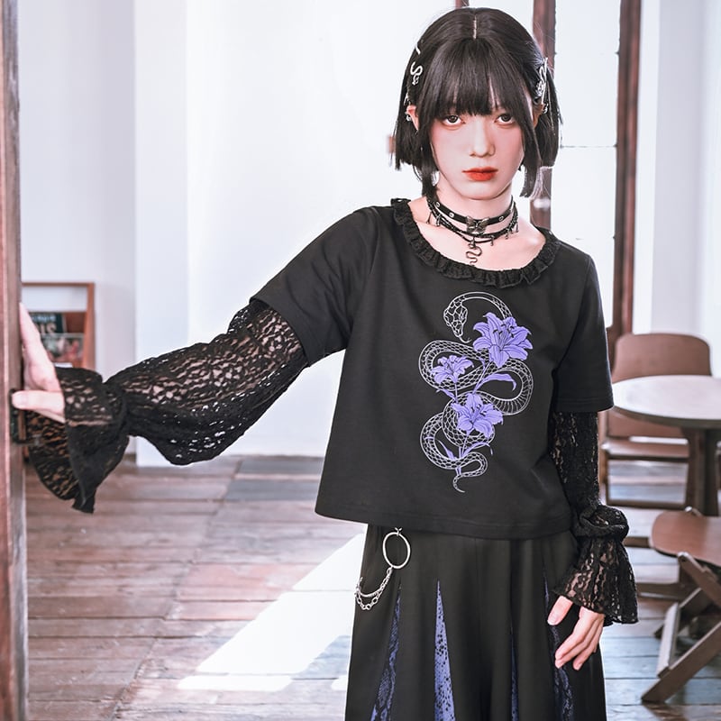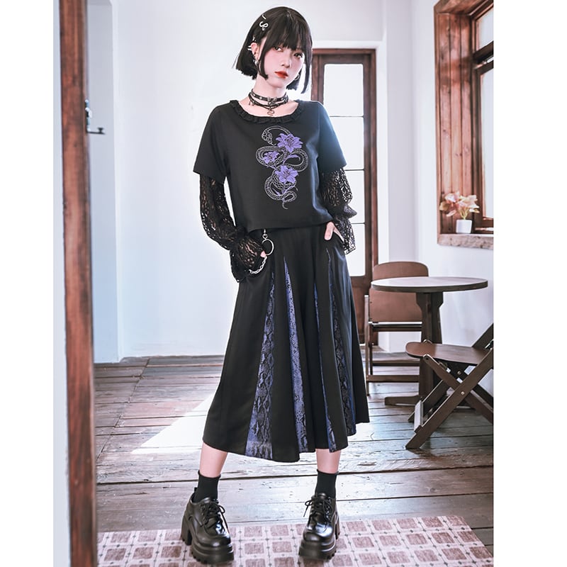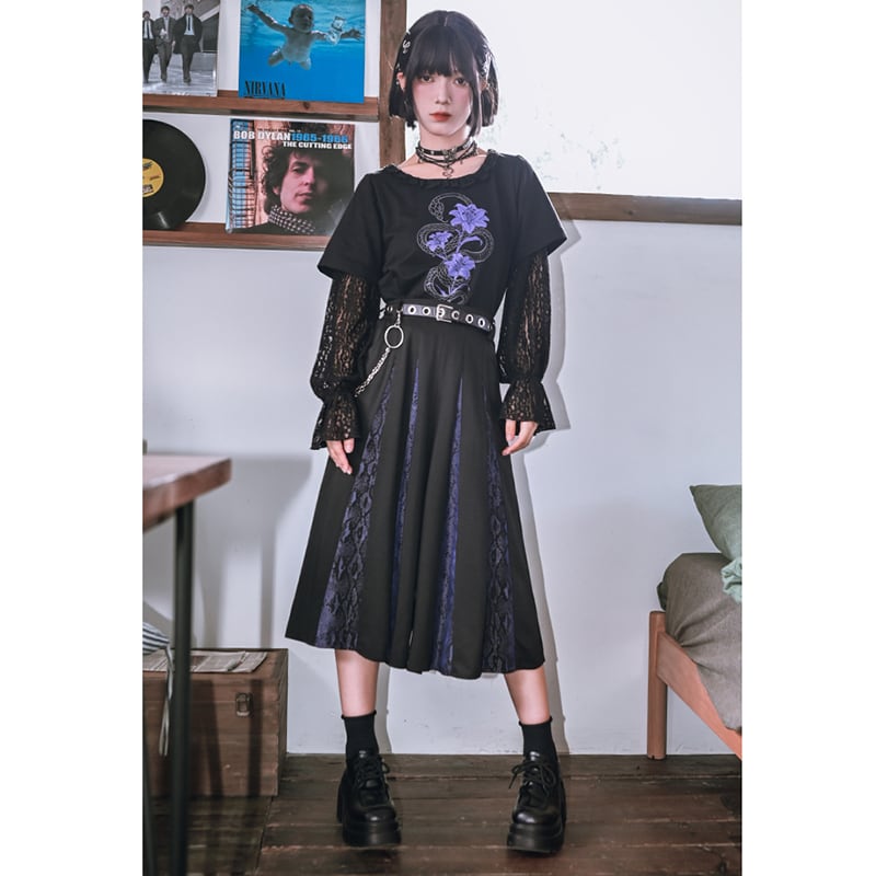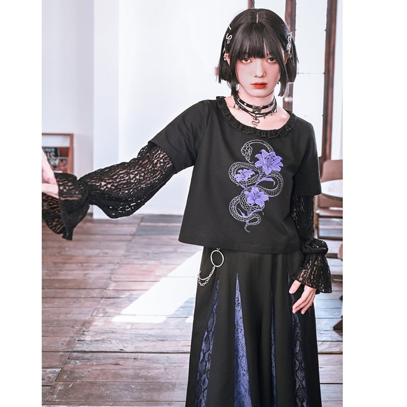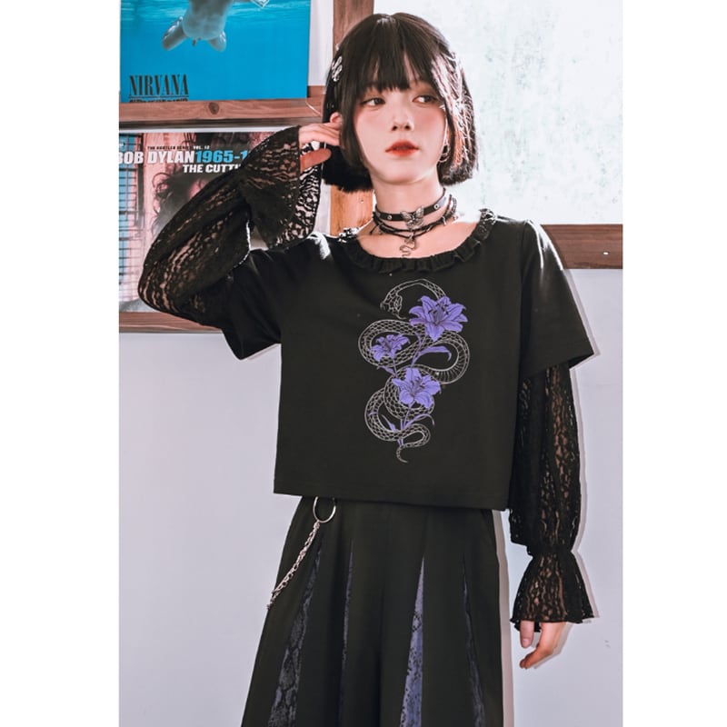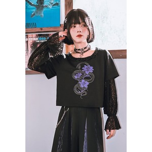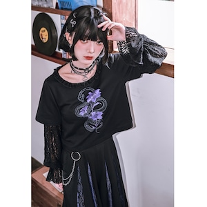 【古怪舍---鱗境シリーズ】★チャイナ風トップス★ Tシャツ 長袖Tシャツ 切り替え フェイクレイヤード 黒 ブラック