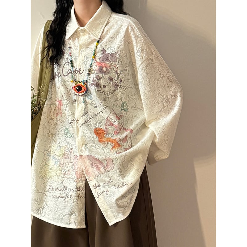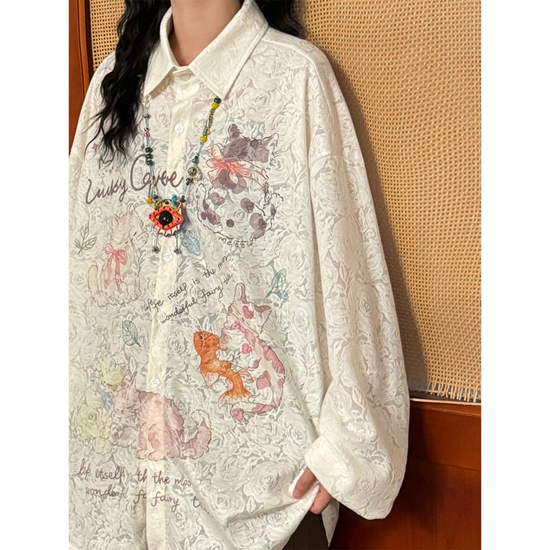【UATONLINEシリーズ】★シャツ★ トップス 花柄シャツ 長袖シャツ 男女兼用 メンズ 猫 猫柄 カートゥーン
