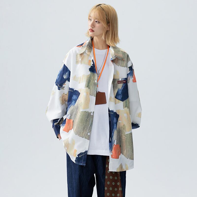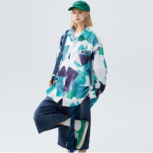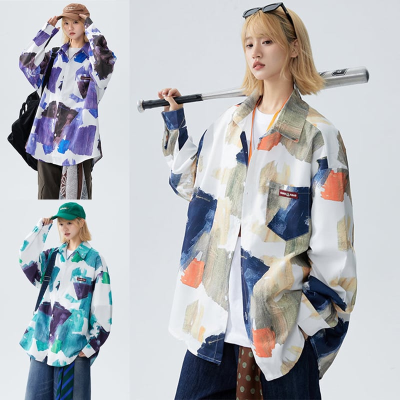 ✿秋新作!【藤伊曼シリーズ】★シャツ★ 3color トップス 長袖シャツ 油絵風 男女兼用 メンズ レディース 大きいサイズ 配色 おしゃれ