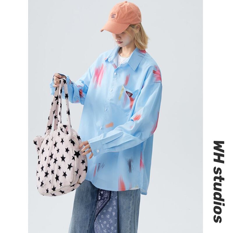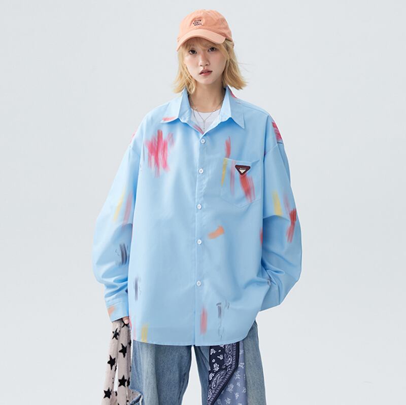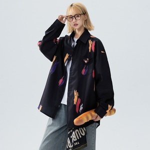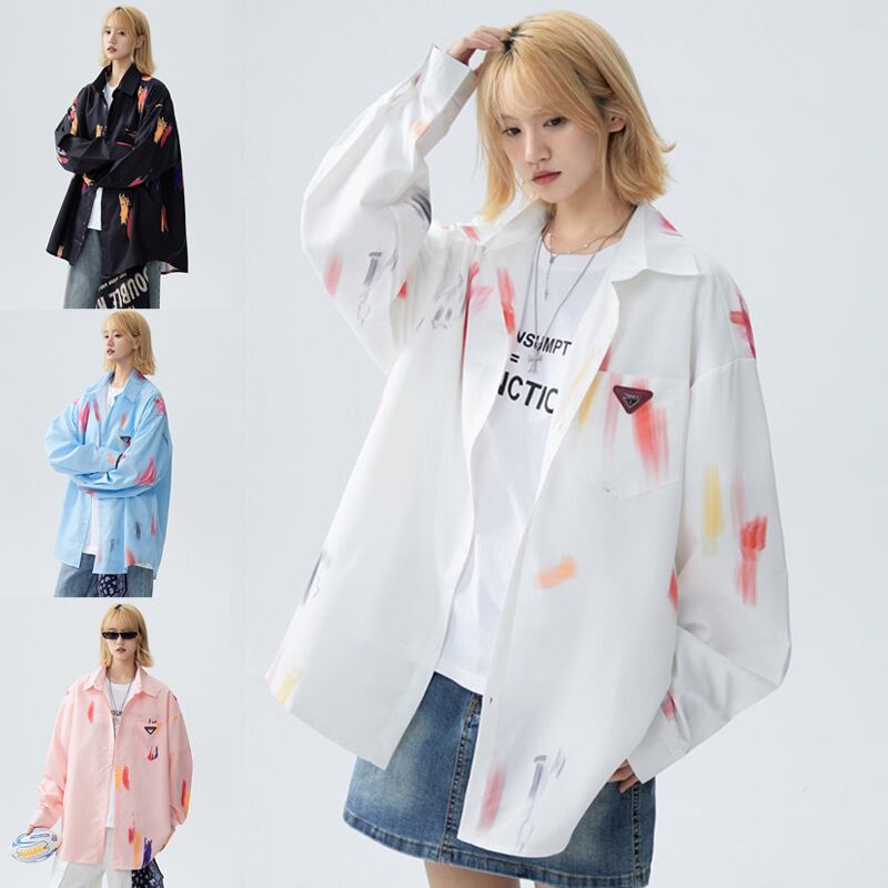 ✿秋新作!【藤伊曼シリーズ】★シャツ★ 4color トップス 長袖シャツ 男女兼用 メンズ レディース 大きいサイズ 落書き 黒 白 青