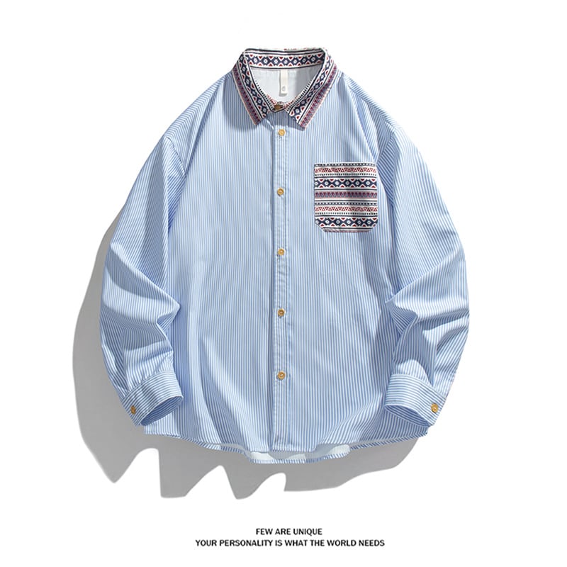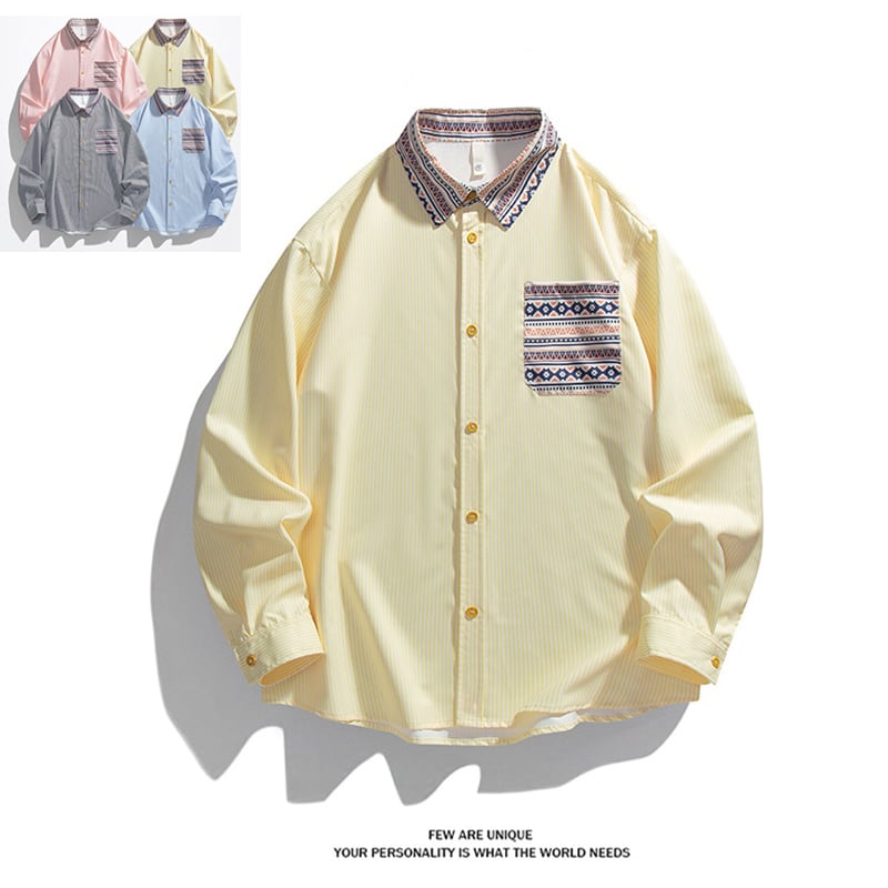 ✿秋新作!【逃離地球シリーズ】★チャイナ風トップス★ 4color シャツ 長袖シャツ 男女兼用 メンズ 縦縞 縞模様 黒 黄 青