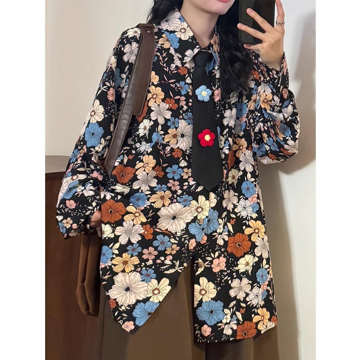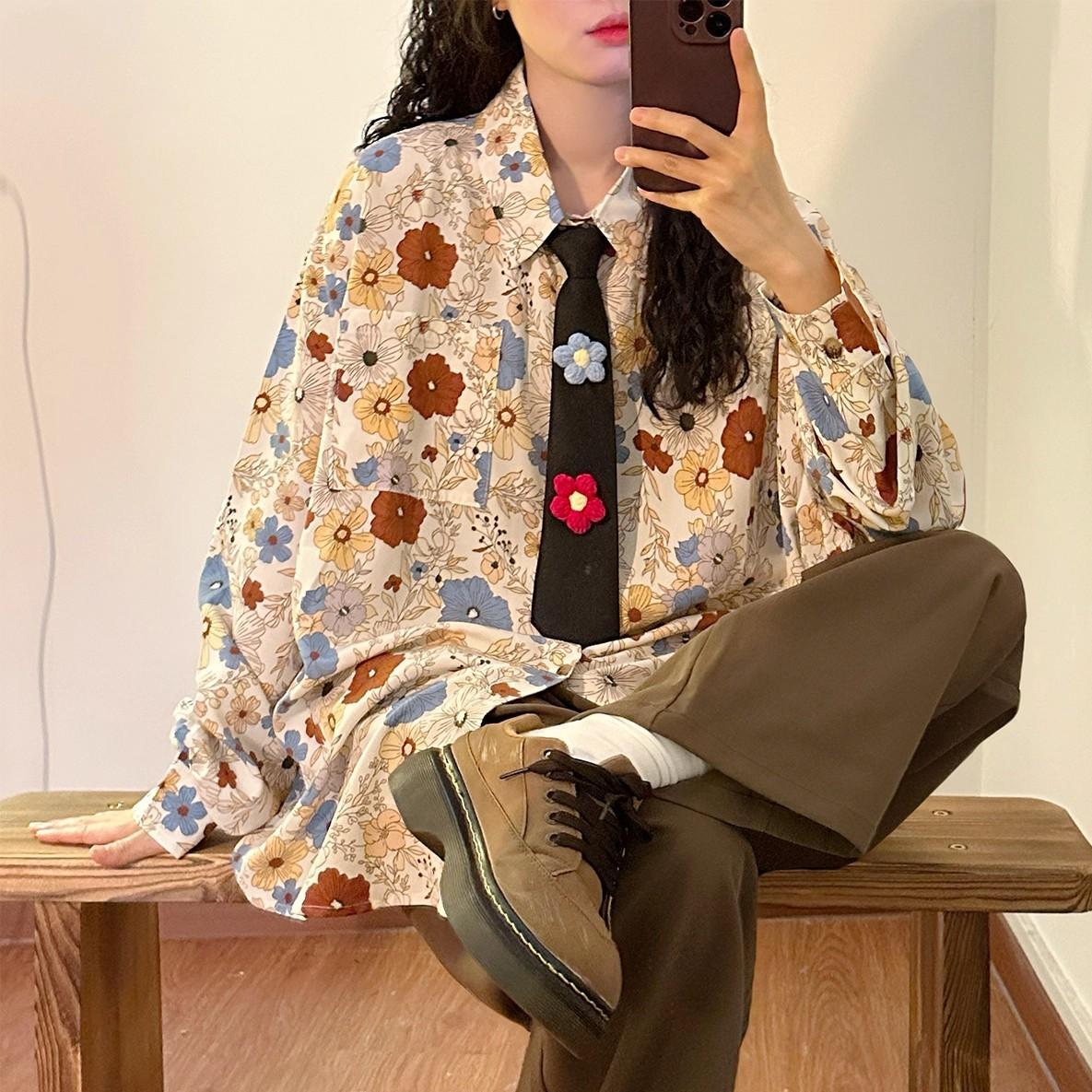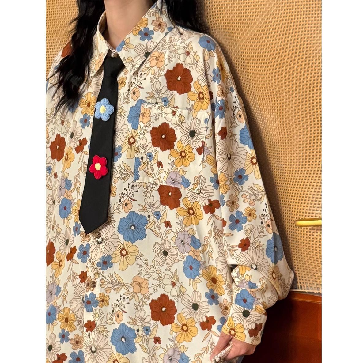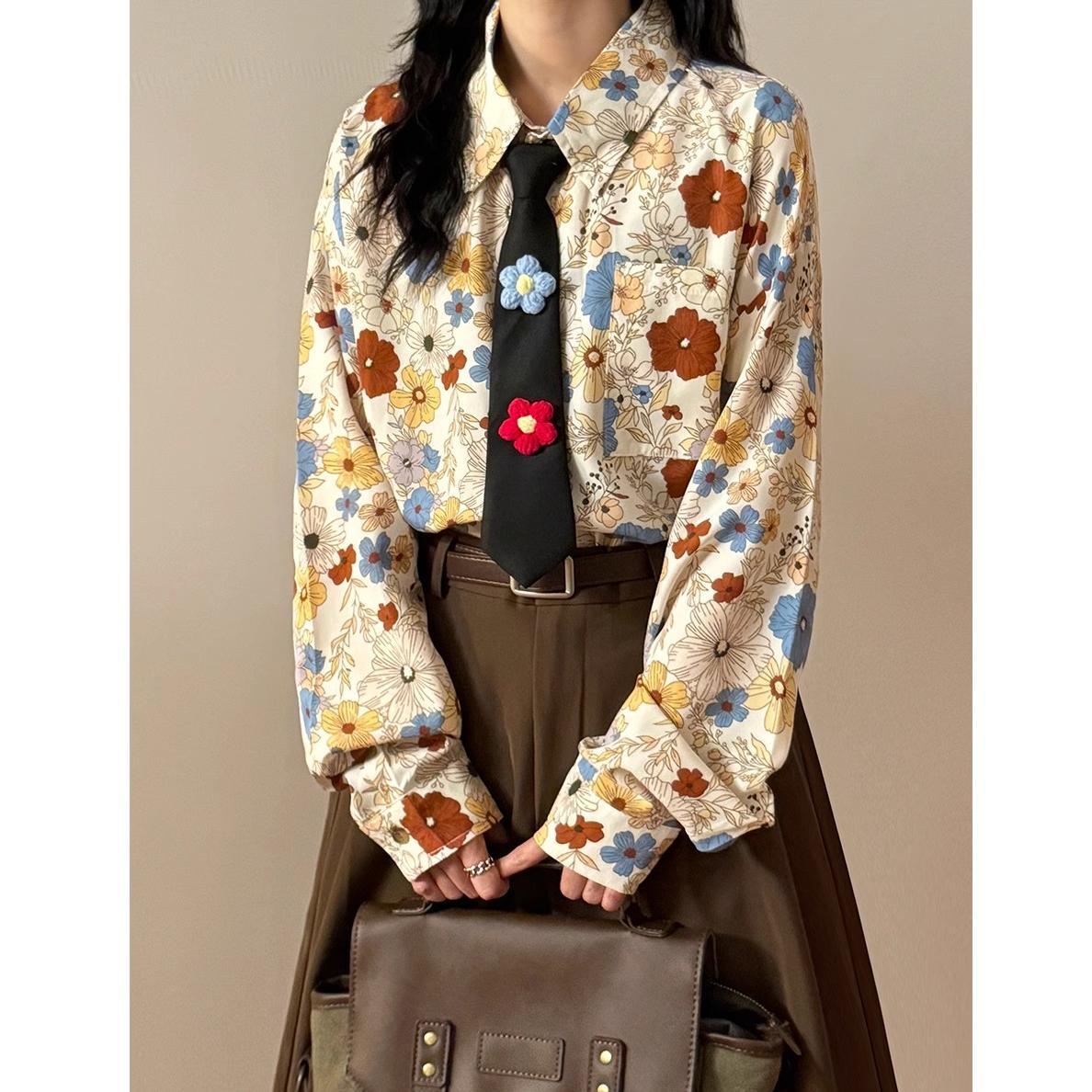 ✿秋新作!【BUNACCシリーズ】★ネクタイ付きシャツ★ トップス 長袖シャツ 花柄 POLO 白い ブラック 男女兼用 メンズ レディース 黒い ホワイト