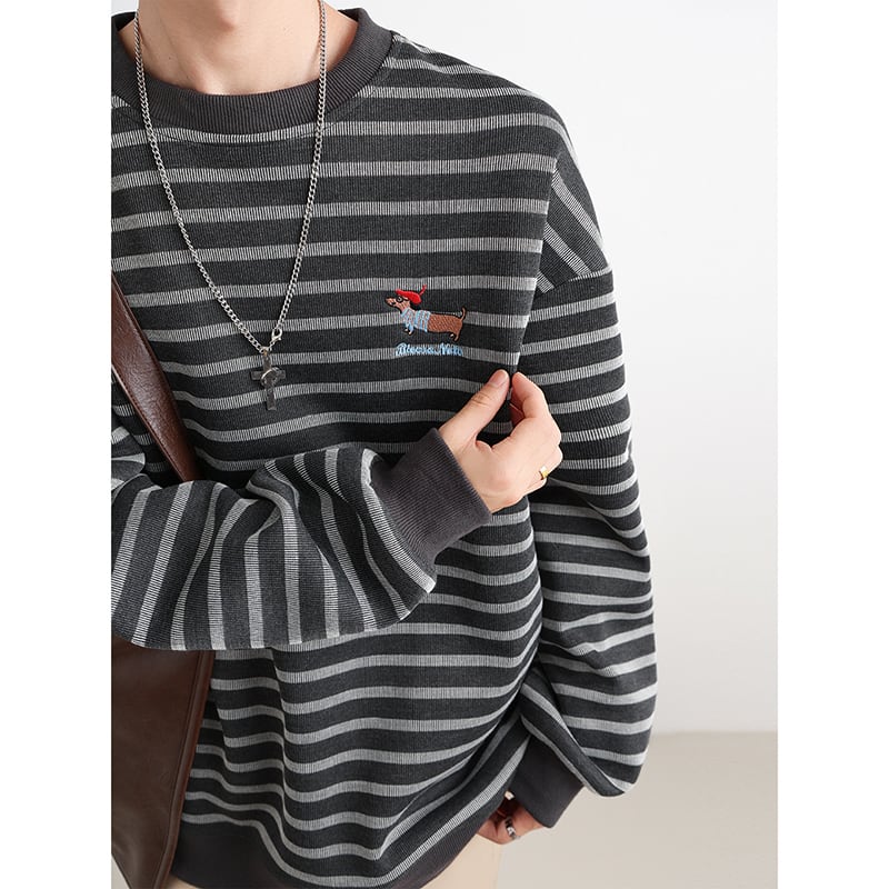 ✿秋新作!【BIGEMANシリーズ】★トップス★ 3color スウェット 長袖シャツ 男女兼用 メンズ 大きいサイズ 犬 いぬ 黒 灰 横縞 縞模様
