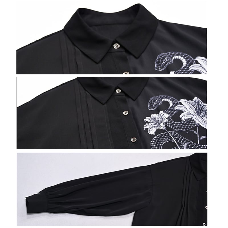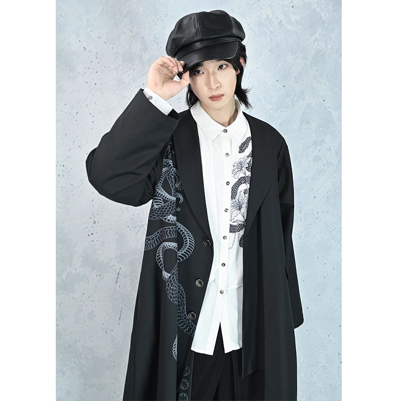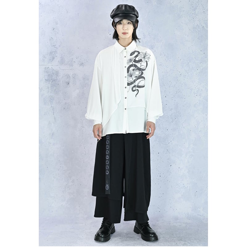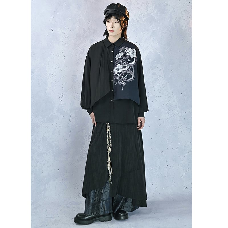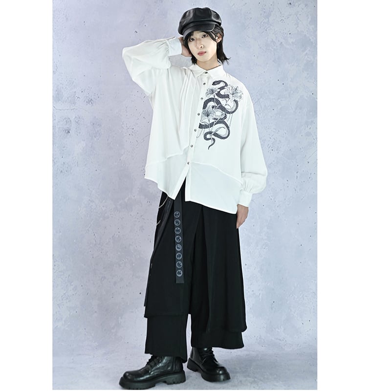 【遊幻齋---鱗境シリーズ】★チャイナ風トップス★ 2color シャツ メンズ 黒 白 フェイクレイヤード プリント