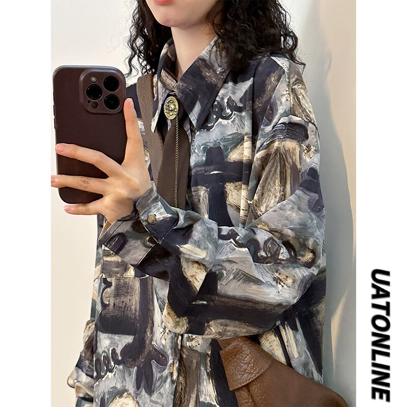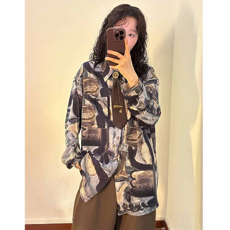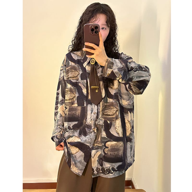 ✿秋新作!【UATONLINEシリーズ】★チャイナ風トップス★ シャツ ネクタイ付き 油絵風 長袖シャツ トップス 男女兼用 メンズ カジュアル