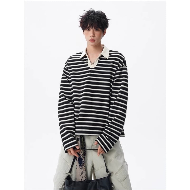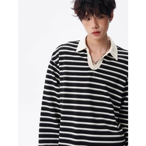 【高墣シリーズ】★長袖シャツ★ 2color トップス 男女兼用 POLO メンズ カジュアル 横縞 縞模様 ブラック 黒 白