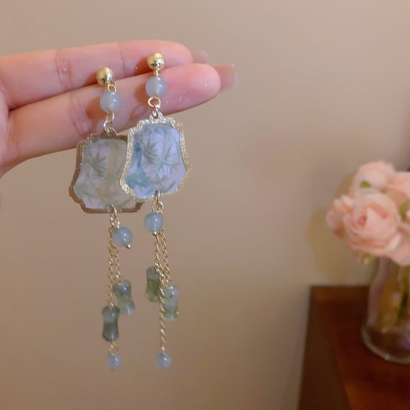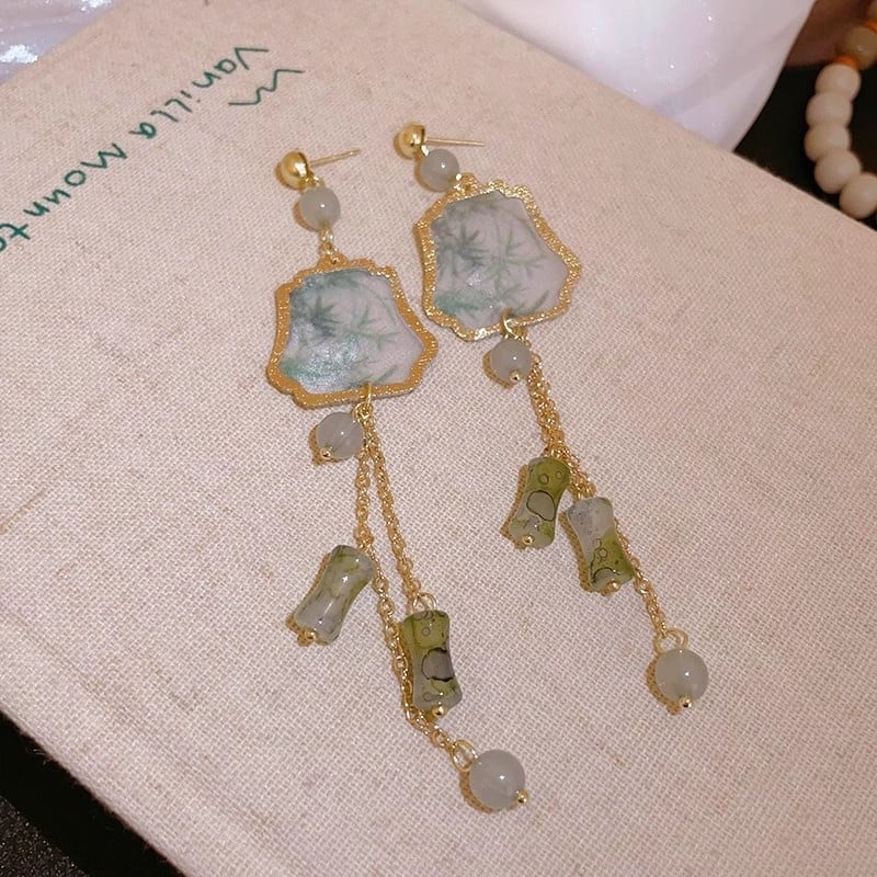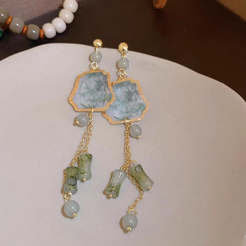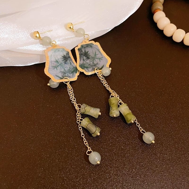 【MEETシリーズ】★チャイナ風耳飾り★ 竹柄 ピアス ペア 小物 気質アップ アクセサリー レディース 水墨画 グリーン