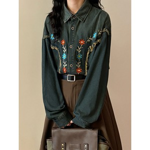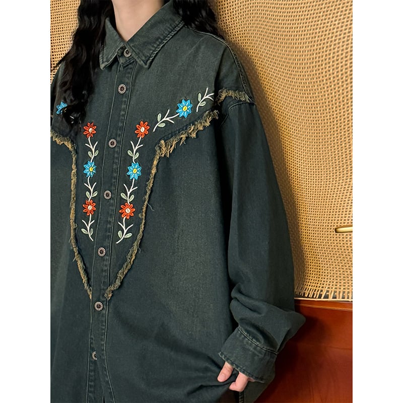 ✿秋新作!【UATONLINEシリーズ】★シャツ★ 花柄 刺繍 2color トップス 長袖シャツ 男女兼用 メンズ デニム カジュアル