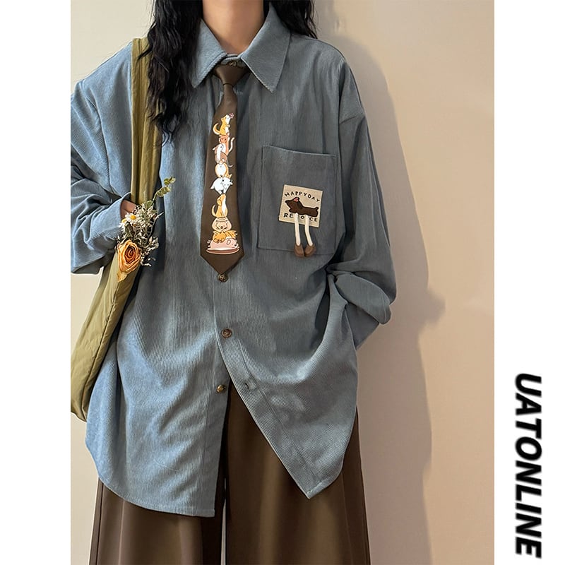 ✿秋新作!【UATONLINEシリーズ】★シャツ★ 2color ネクタイ付き トップス 長袖シャツ トップス 男女兼用 メンズ コーデュロイ 猫 ネコ