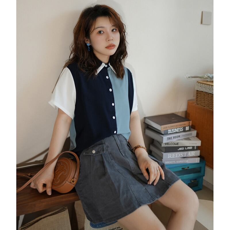 【YGMSシリーズ】★シャツ★ 半袖シャツ トップス 切り替え 配色 レディース ブルー 青い 合わせやすい