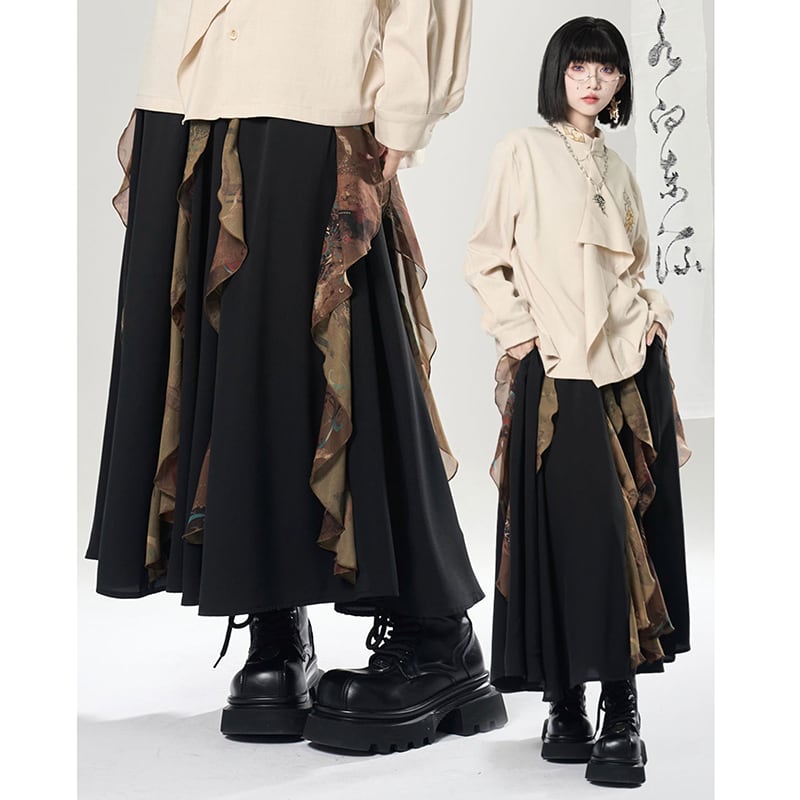 【卿棠---舞獅シリーズ】★チャイナ風スカート★ 切り替え ボトムス レディース 配色 プリント ウエストゴム