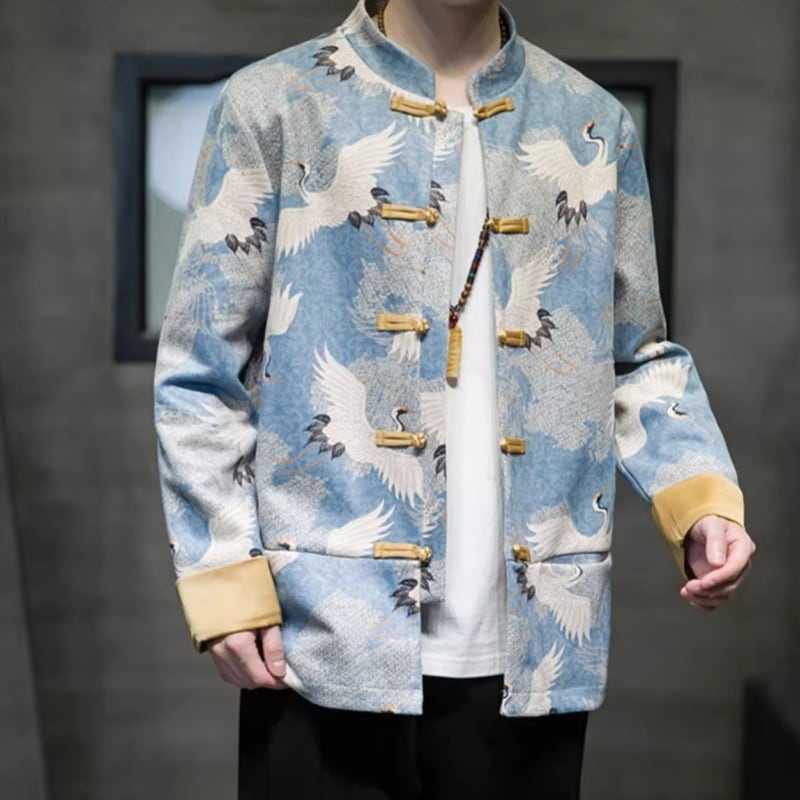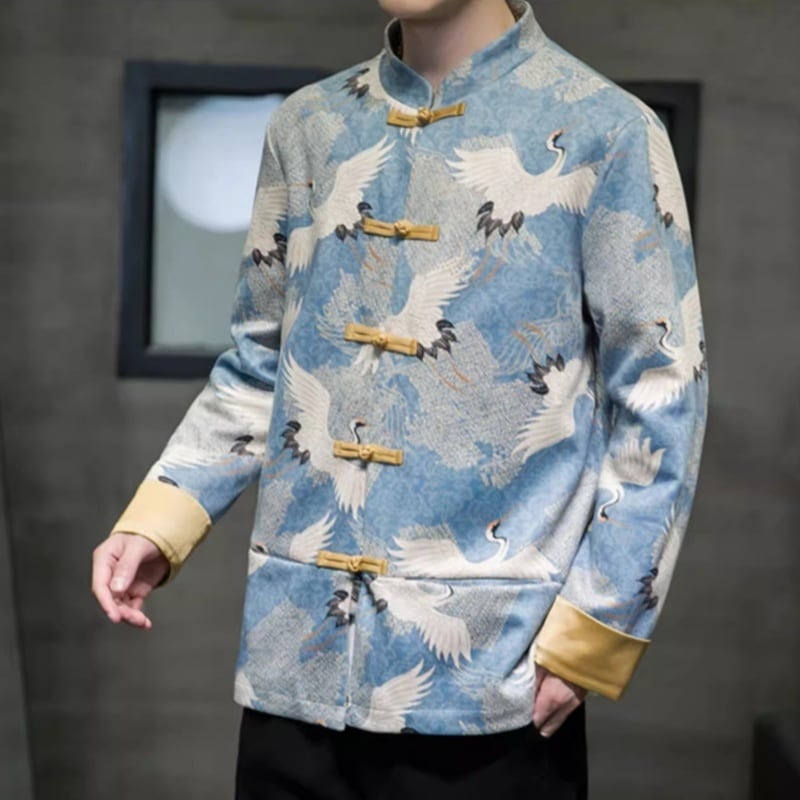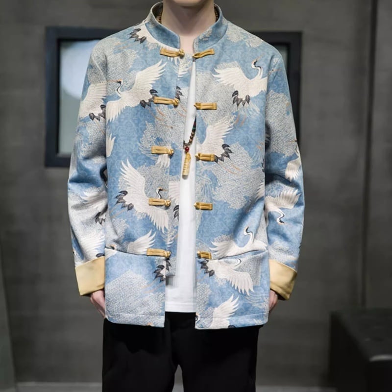 【XILANGBAOシリーズ】★チャイナ風アウター★ コート 男女兼用 鶴 つる ツル メンズ 改良唐装 中華服 ライトブルー 合わせやすい