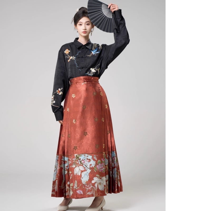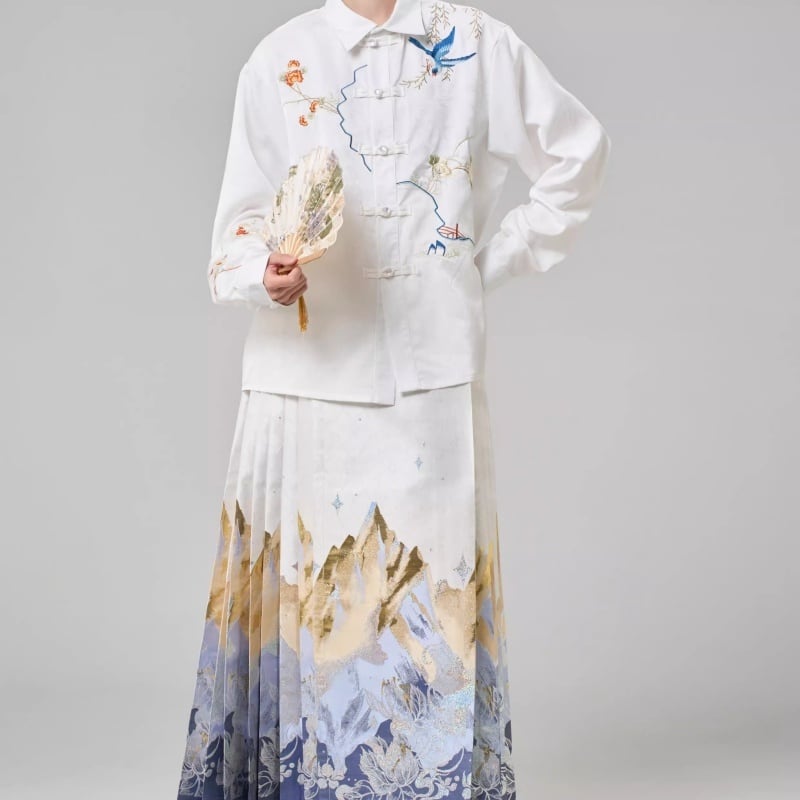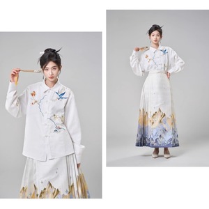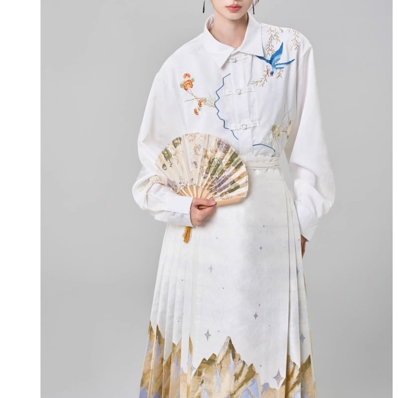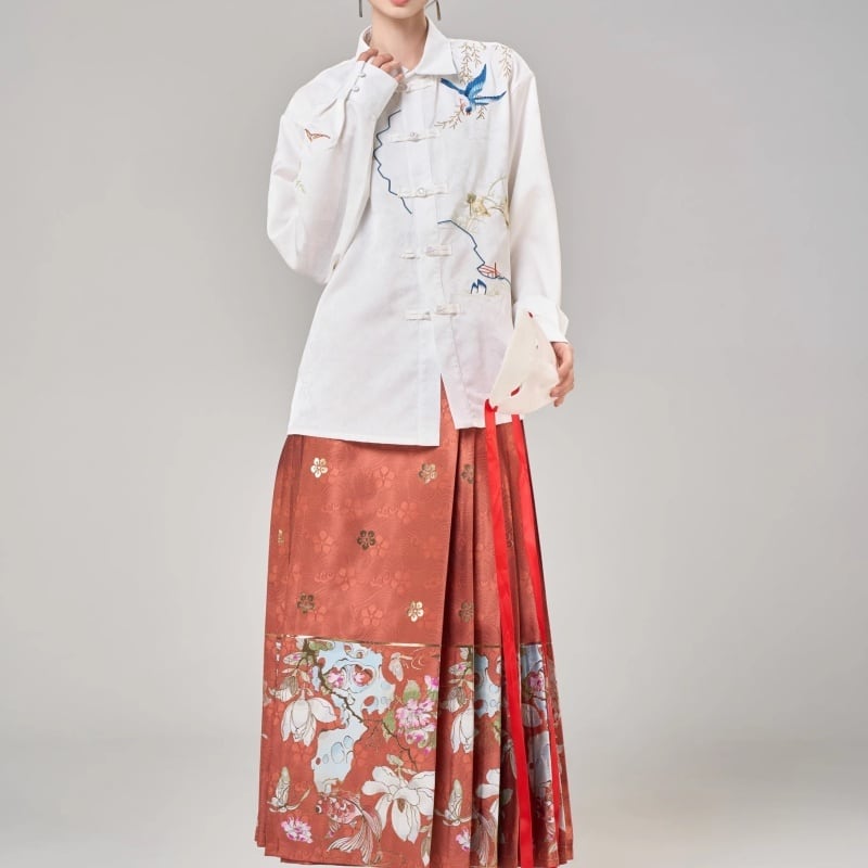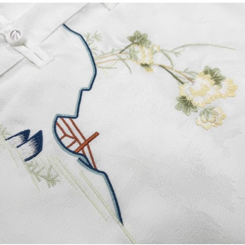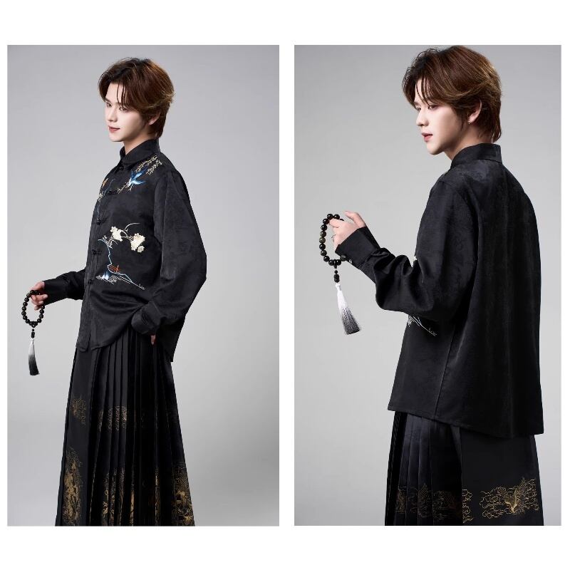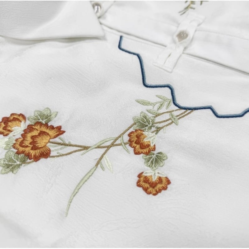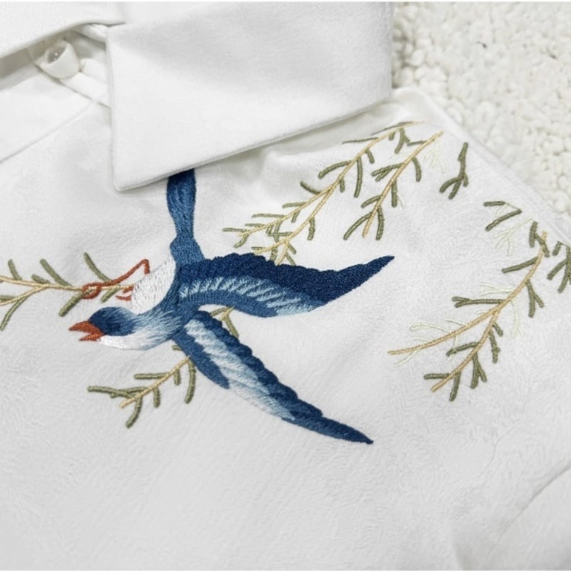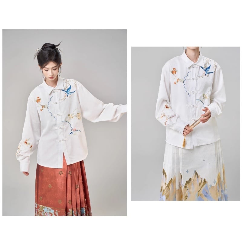 【羽月司衣シリーズ】★チャイナ風シャツ★ トップス 刺繍入り レディース 中華服 男女兼用 長袖シャツ 鳥と葉柄 漢服シャツ メンズ ホワイト 黒